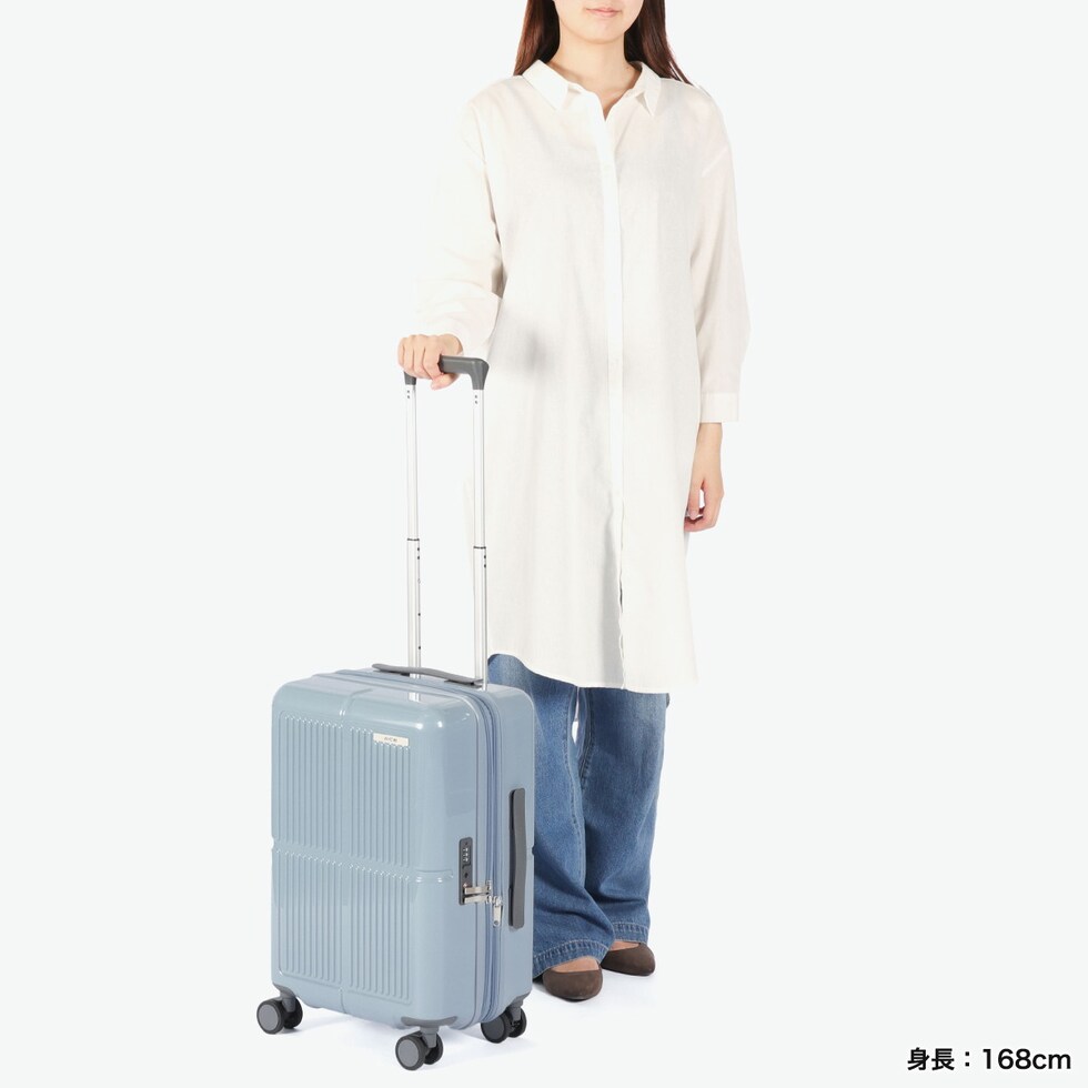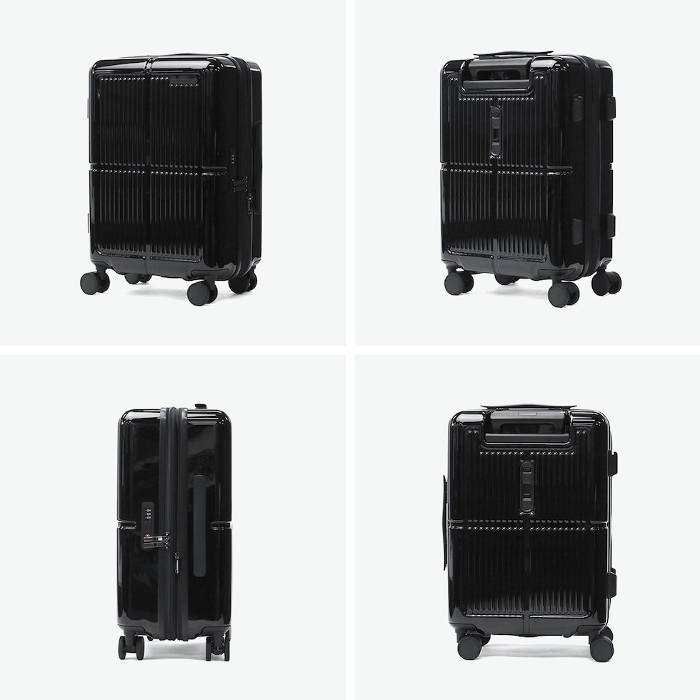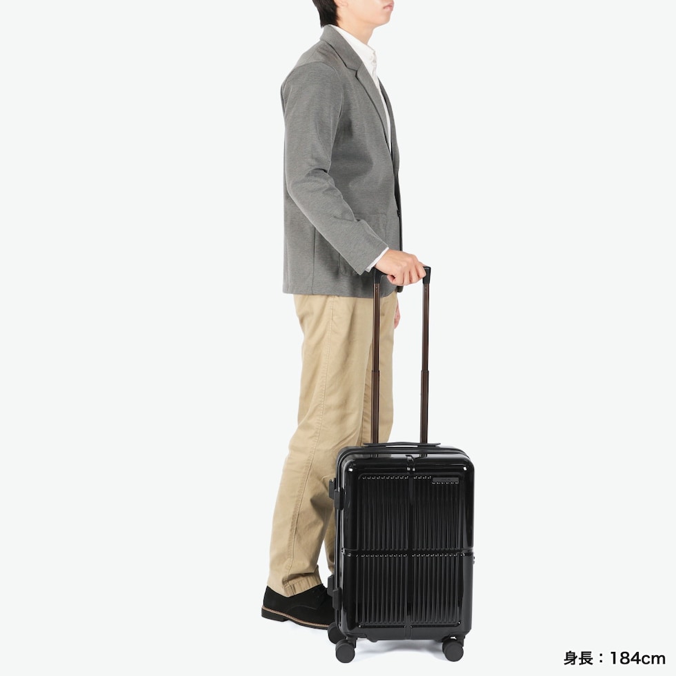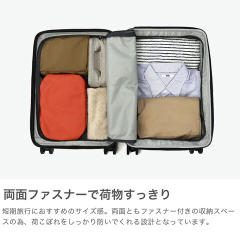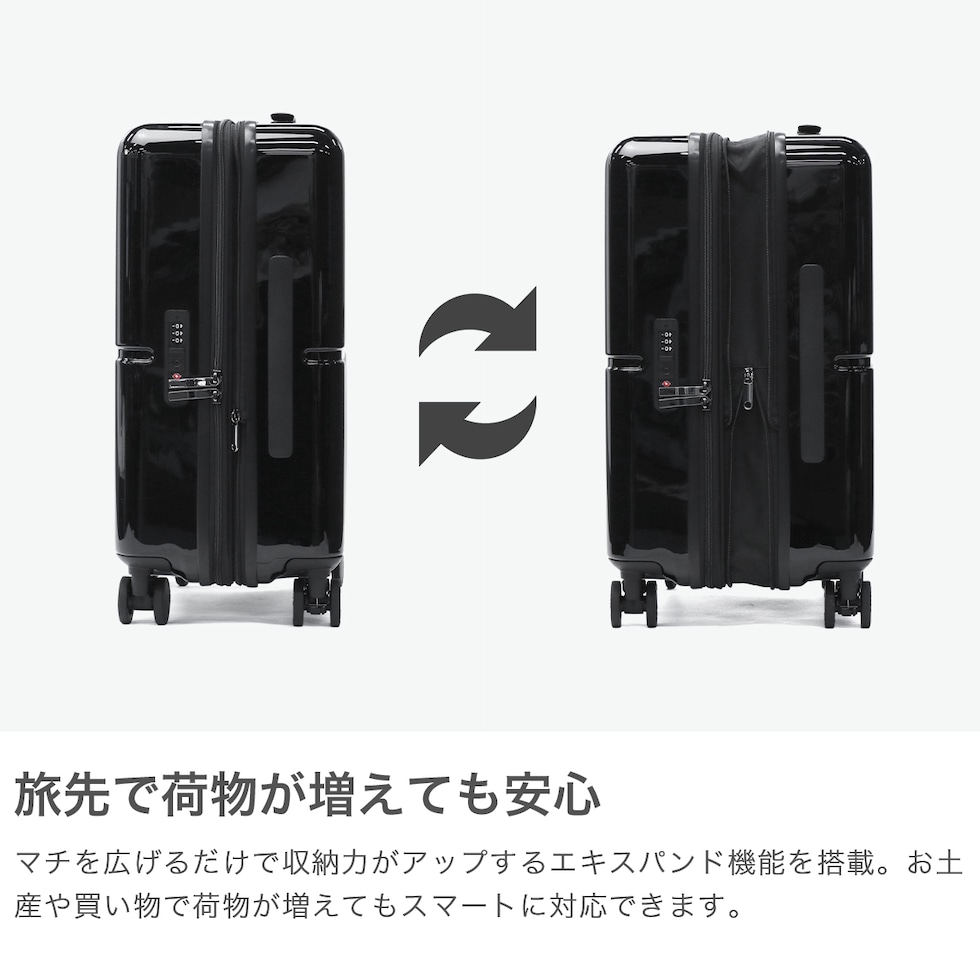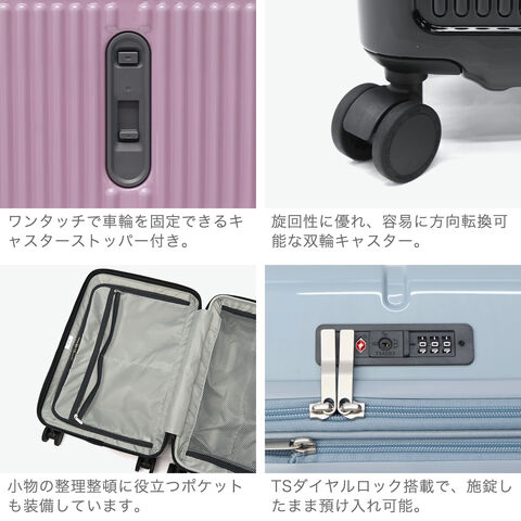 | 荷物も気分も軽やか 機能充実キャリー 鮮やかな鏡面ボディが目を引く『ファームロード』シリーズの、3~4泊程度の旅に適した33L容量のスーツケースです。エキスパンド機能で40Lまで容量を拡大できるので、旅先で荷物が増えても安心。電車内や坂道で便利なキャスターストッパーや、小物を掛けられるサイドフックなど、快適な旅を支える機能が満載です。 |