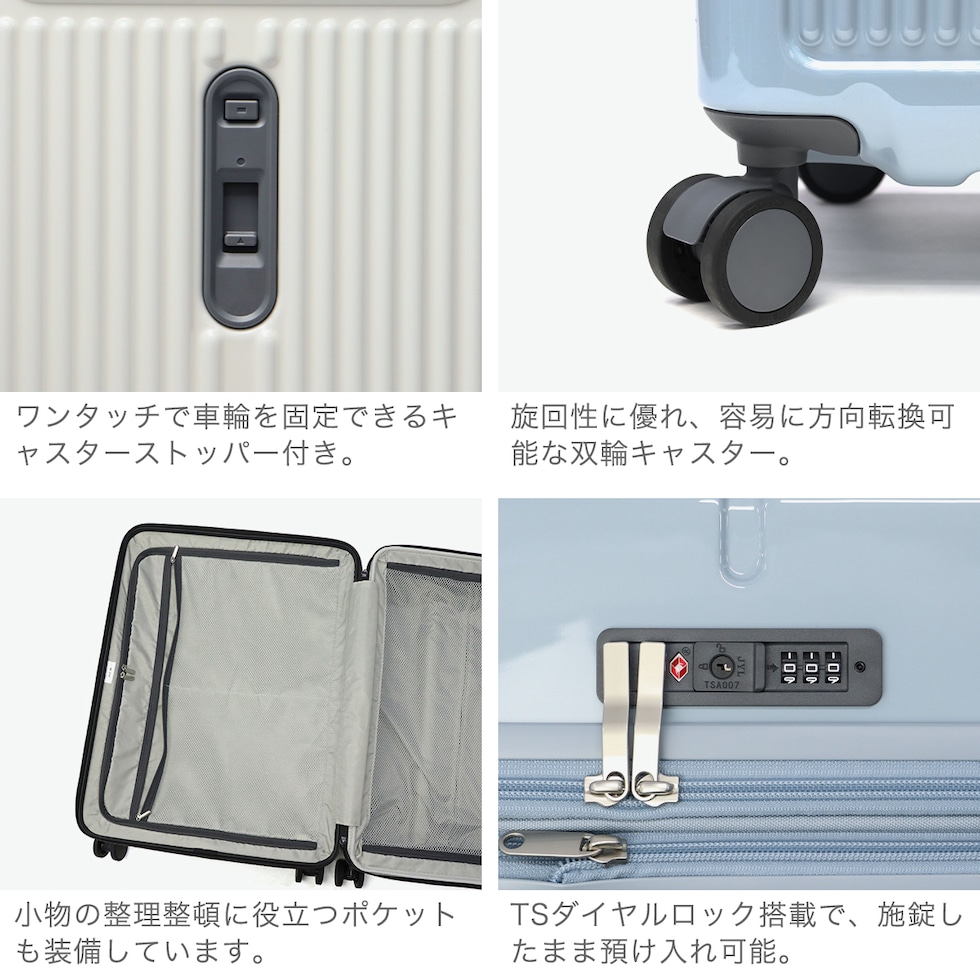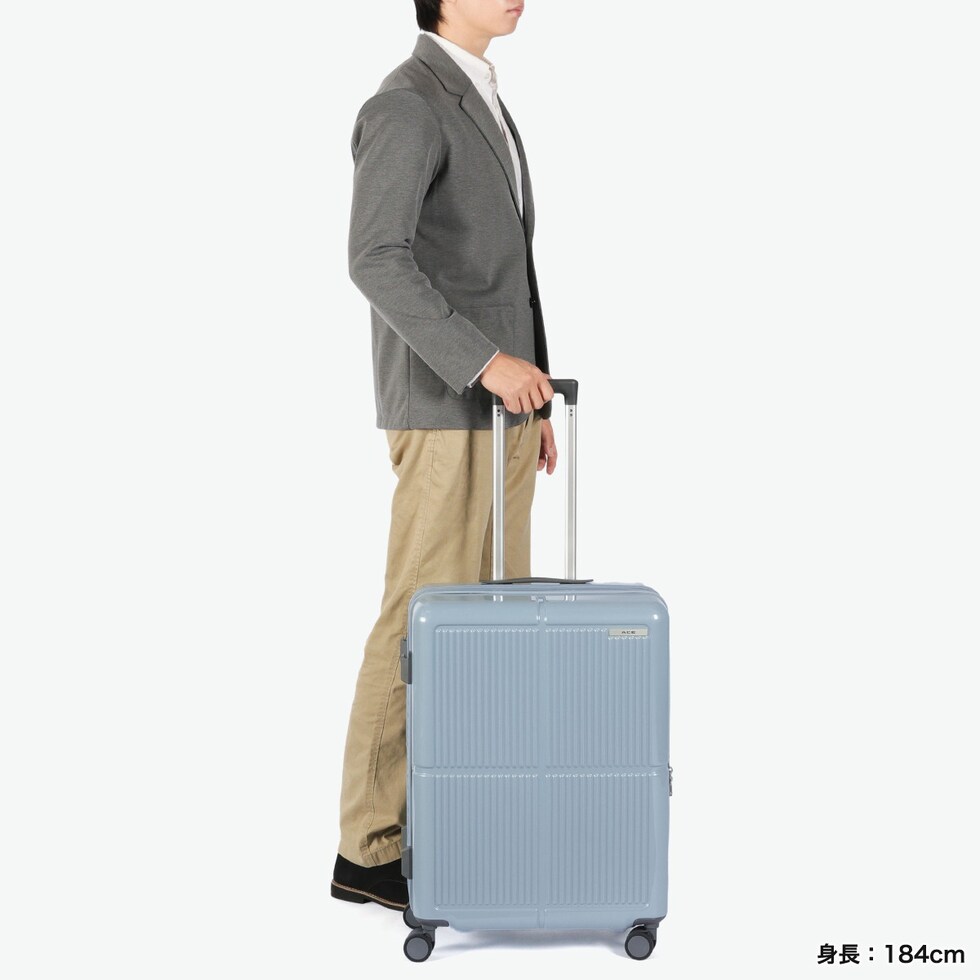 | 荷物が増えても安心 軽やかに旅するキャリー 鮮やかな鏡面ボディが目を引く『ファームロード』シリーズの、6~8泊程度の旅に適した63L容量のスーツケースです。エキスパンド機能で75Lまで容量を拡大できるので、旅先で荷物が増えても安心。電車内や坂道で便利なキャスターストッパーや、小物を掛けられるサイドフックなど、快適な旅を支える機能が満載です。 |