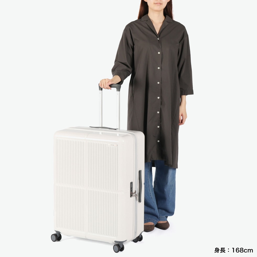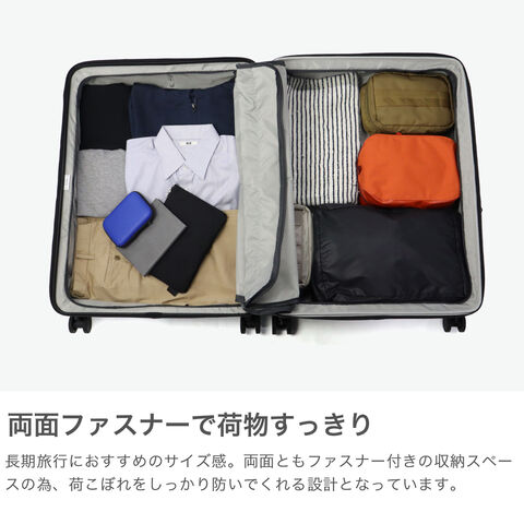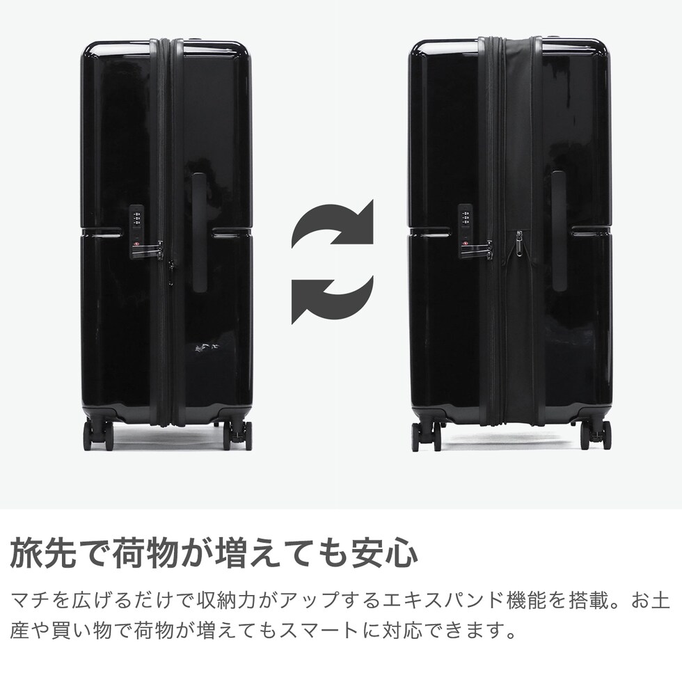 | 鏡面ボディが輝く 大容量×機能性キャリー 鮮やかな鏡面ボディが目を引く『ファームロード』シリーズの、8~11泊程度の旅に適した89L容量のスーツケースです。エキスパンド機能で106Lまで容量を拡大できるので、旅先で荷物が増えても安心。電車内や坂道で便利なキャスターストッパーや、小物を掛けられるサイドフックなど、快適な旅を支える機能が満載です。 |