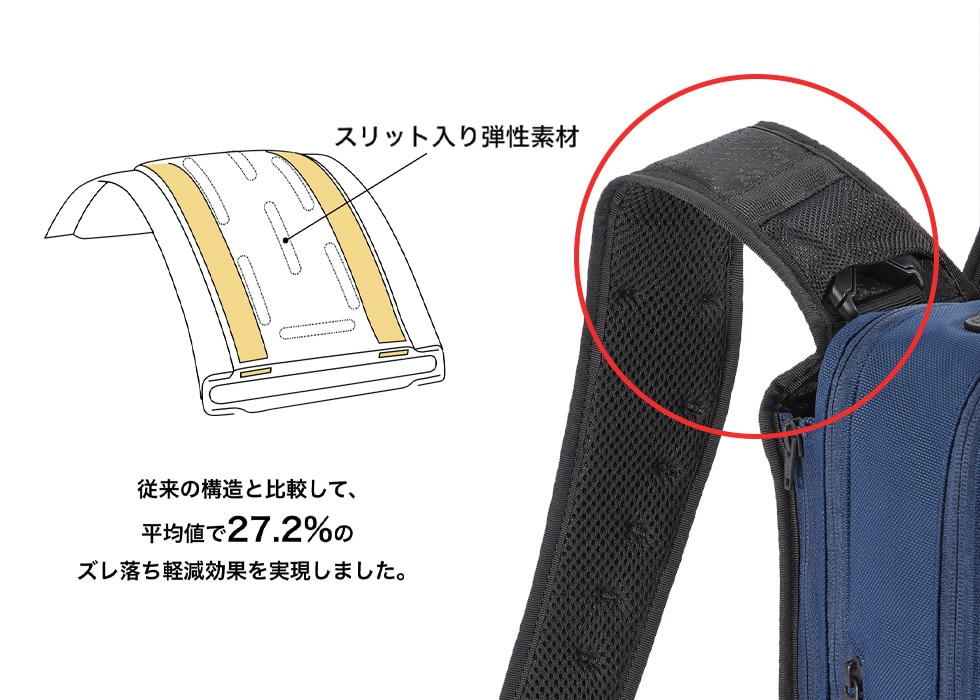 ズレ落ちの原因である、肩に垂直に圧力がかからないことやパッドの接地面が少なくならないよう、肩の凹凸に沿うスリット入り伸縮素材をテープで両端から押さえる構造に。パッド全体を肩にフィットさせながら垂直成分の割合を高め、従来構造と比較して平均値で約27.2%のズレ落ち軽減効果を実現しました。