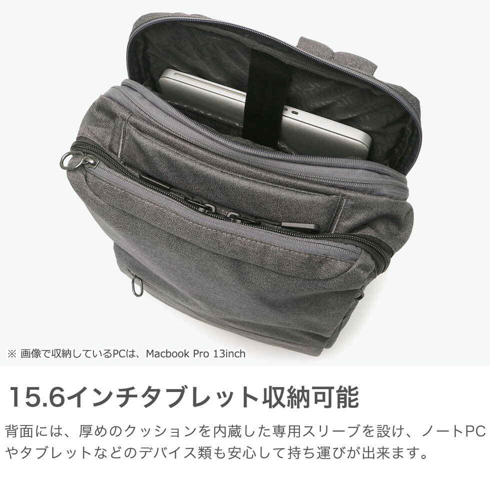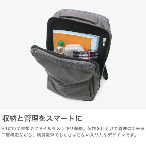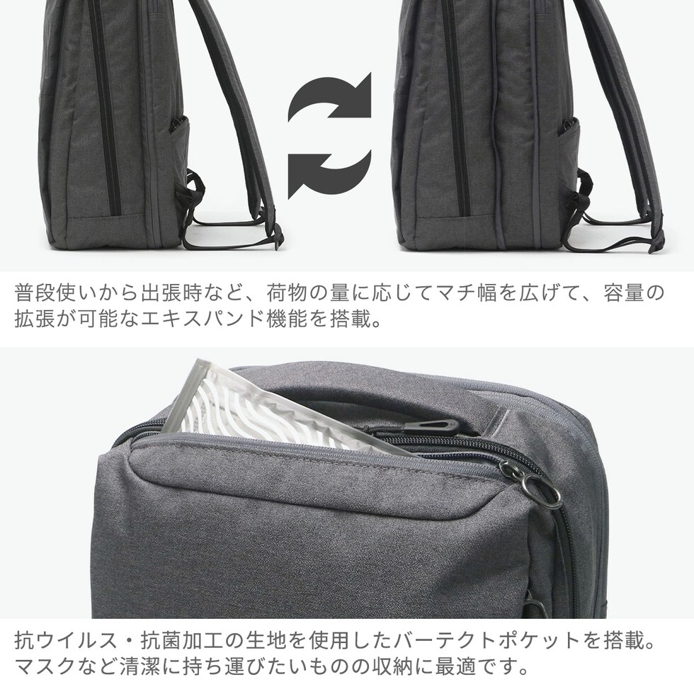 日々の仕事をアシスト シンプルながらも選び抜かれた機能性を持つ「ホバーライト」シリーズのリモデル版、『ホバーライト2』のリュック。シリーズの特徴でもある抗菌防臭・抗ウイルスのバーテクト生地は、フロント上部のジップポケットに使われています。軽量かつ、内外の豊富なポケットやマチの拡張機能など、頼りになる機能が満載。理想的なビジネススタイルを実現する仕上がりになっています。 |