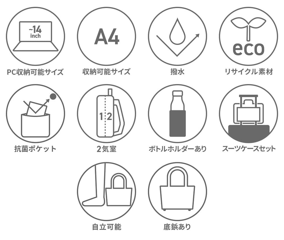 | 仕様 | <外側> ジップポケット(M)×3 ジップポケット(S)×1 <前面収納> スナップポケット(L)×1 ジップポケット(M)×1 ポケット(S)×2 ペンホルダー×2 ボトルホルダー×1 <背面収納> PC収納×1 |