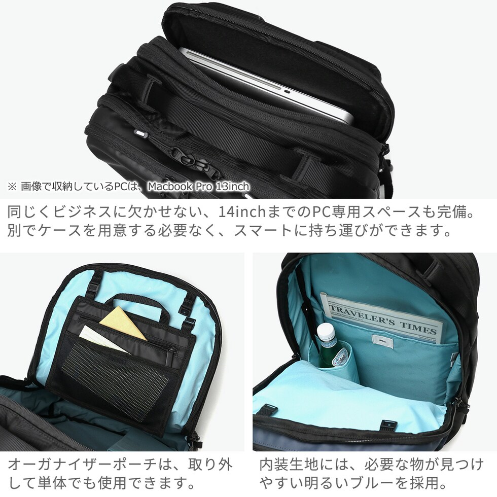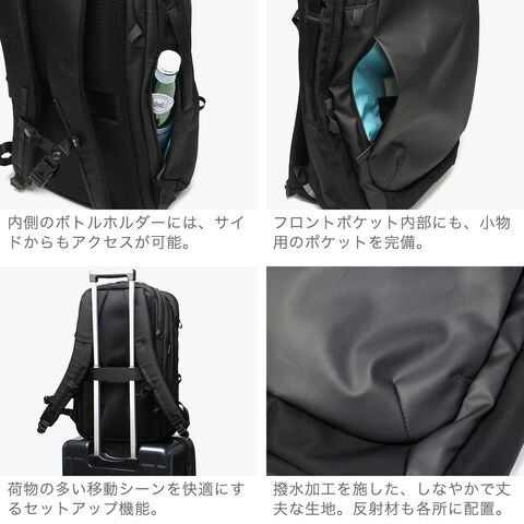 | 仕様 | <外側> ポケット×3 PC収納×1 <内側> ポケット×5 ボトルホルダー×1 ペンホルダー×1 キーフック×1 <付属品> チェストストラップ×1 |