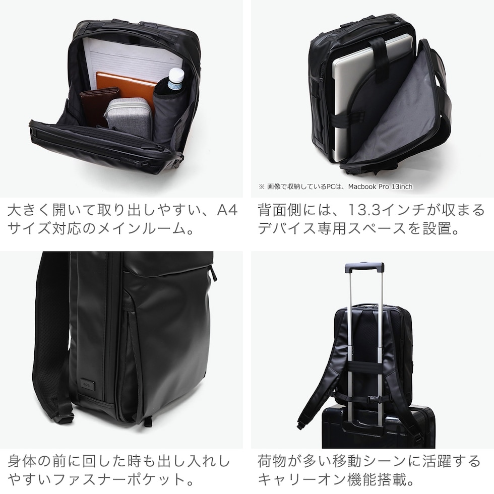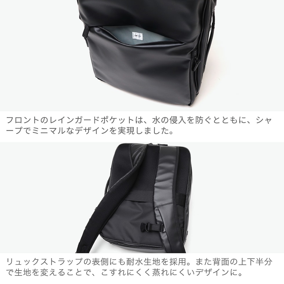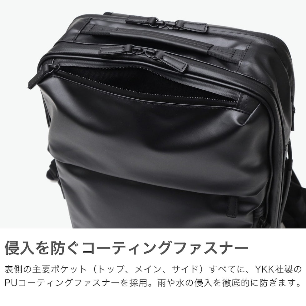 | ビジネスシーンに 305日の安心を ベストセラーのガジェタブルWRシリーズを、ユーザーの意見を取り入れてブラッシュアップした『ガジェタブルWR 2』。耐水生地とコーティングファスナーを採用し、突然の天候の変化や、雨による水濡れから大切な荷物を守ります。こちらは、A4サイズ・11Lモデル。高い収納力と機能性を両立し、ビジネスシーンをスマートにサポートします。 |
