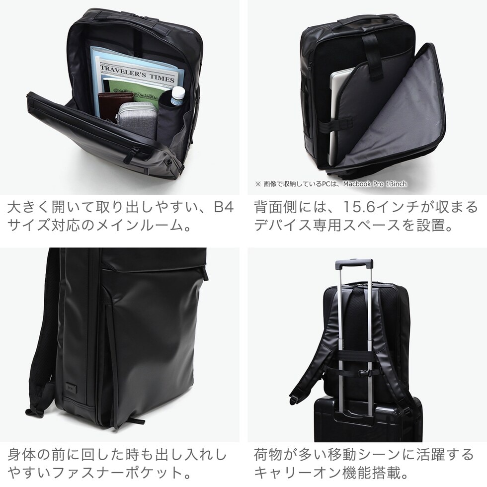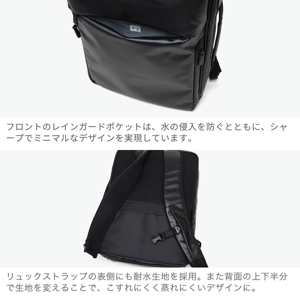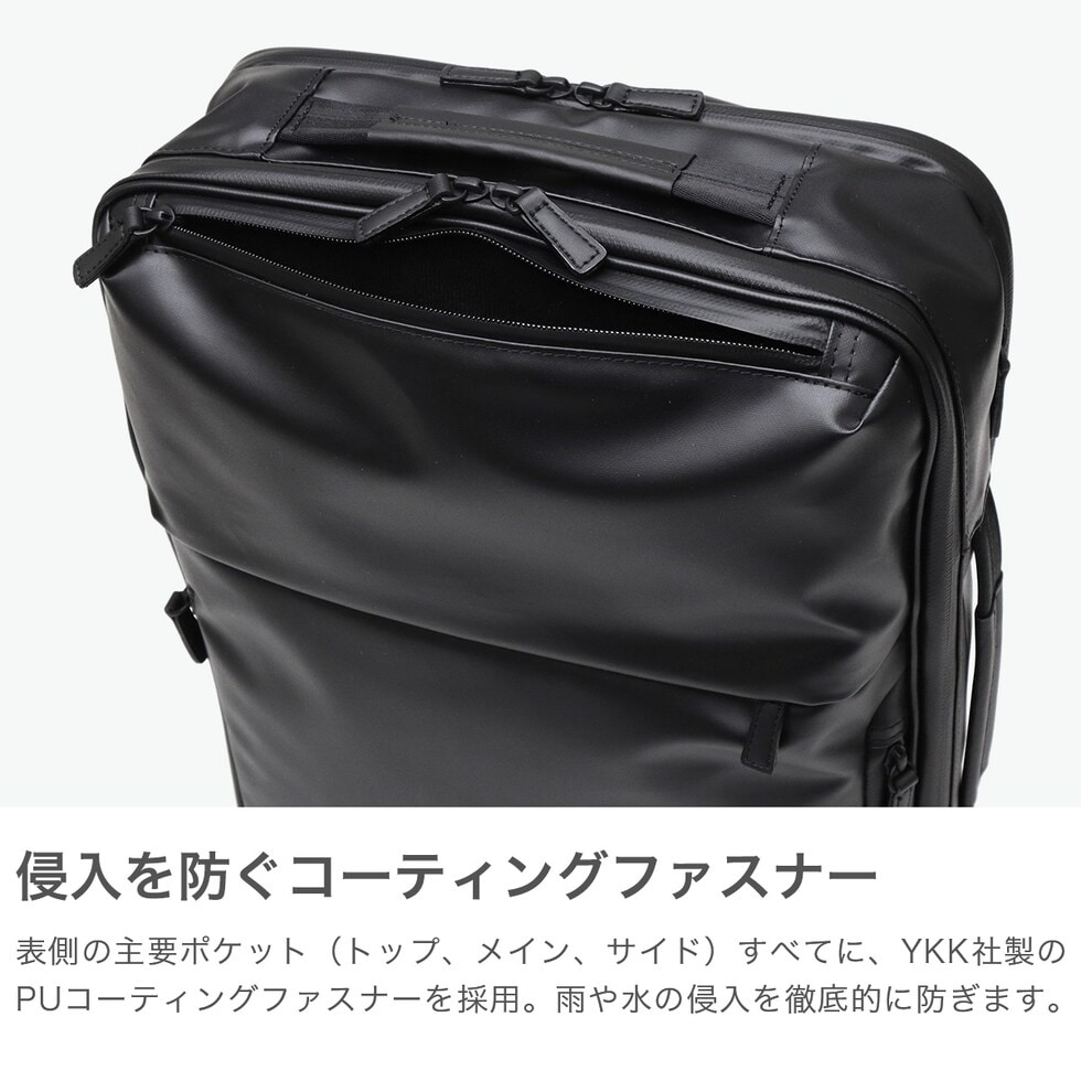 | 雨による水濡れから 大事な荷物を徹底防御 ベストセラーのガジェタブルWRシリーズを、ユーザーの意見を取り入れてブラッシュアップした『ガジェタブルWR 2』。耐水生地とコーティングファスナーを採用し、突然の天候の変化や、雨による水濡れから大切な荷物を守ります。こちらは、B4サイズ・16Lモデル。高い収納力と機能性を両立し、ビジネスシーンをスマートにサポートします。 |
