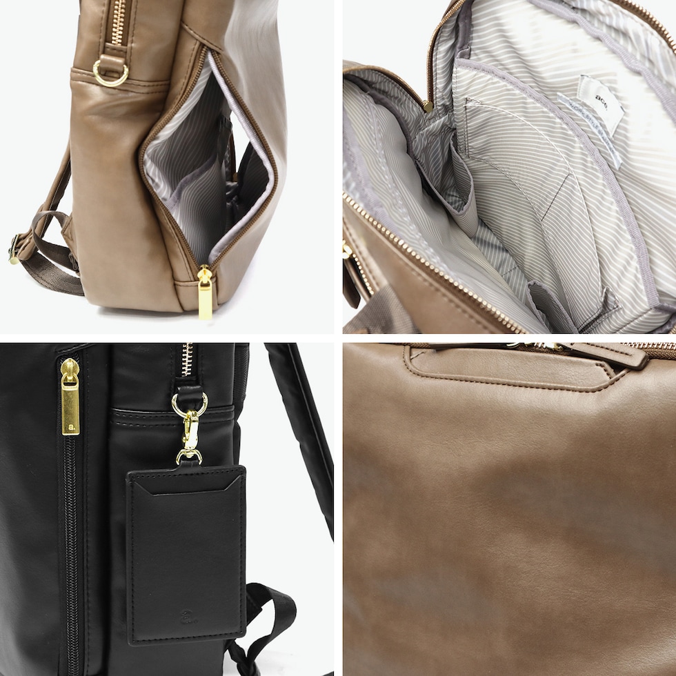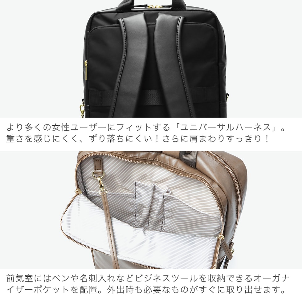 | 洗練シルエットで軽快に スマートな通勤スタイル シンプルでスリムな女性向けビジネスリュックシリーズ『FITEMME CLASS/フィッテムクラス』。ビジネススタイルに合わせやすいデザインと上品な素材で展開しました。電車内などで前持ちした際も邪魔になりにくい、スリムでコンパクトなシルエットながら14.0インチのノートPCやA4ファイルに対応、使いやすさにこだわった機能がたくさん備わった収納力抜群のアイテムです。 |