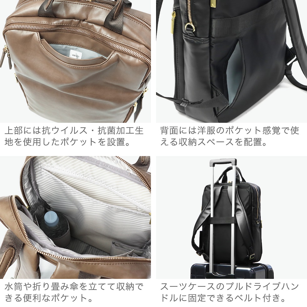 | 仕様 | <外側> ポケット×5 <内側> ポケット×7 PC収納×1 ボトルホルダー×2 ペンホルダー×2 キーリング×1 <付属品> ネームタグ×1 |