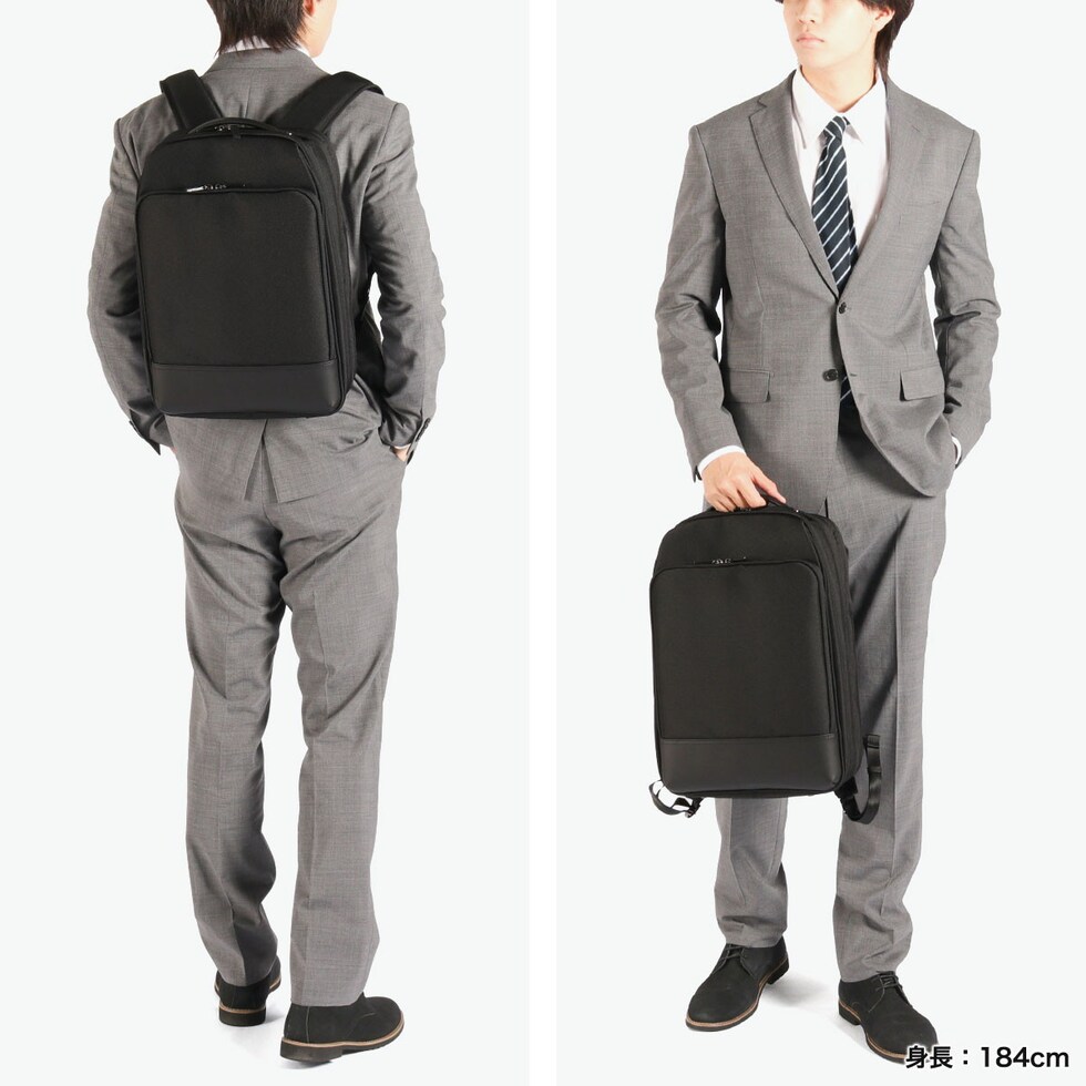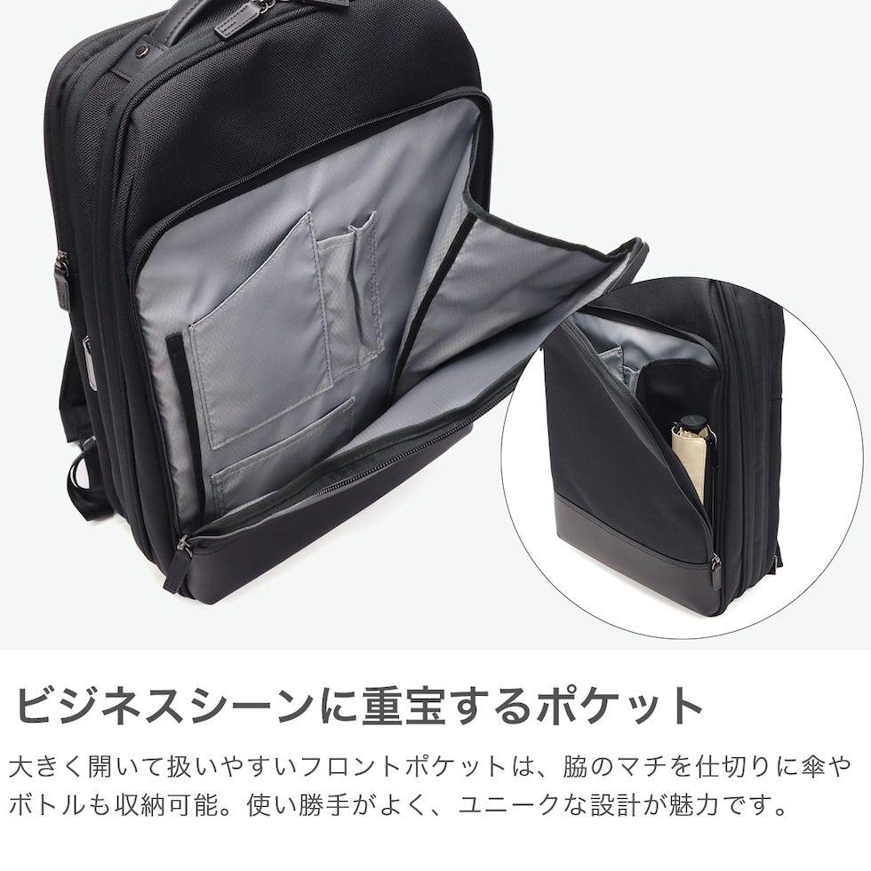 | 広がる収納力 信頼の日本製 北海道の自社工場で仕立てた、国産ビジネスバッグシリーズ『デュラホールド』のビジネスリュック。上質な牛革ハンドルと精巧な縫製が魅力です。B4サイズの書類や15.6インチPC対応で、拡張機能やボトルホルダーなど機能性も充実。出張や外回りに頼れる一品です。 |