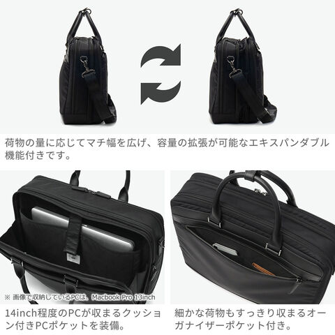 | 出勤シーンで差をつける ワンランク上の存在感 洗練されたデザインと使いやすい機能性を両立させた、『ヴァシリアス』シリーズのビジネスバッグ。2層構造でB4書類や14インチPCが収納可能。また、セットアップ機能付きで通勤から出張までスマートに活躍します。スーツスタイルに自然に馴染み、どんな場面でも落ち着いた印象を与えます。上質な素材使いと細部へのこだわりが、ビジネスシーンでの印象をワンランク上へと引き上げます。 |
