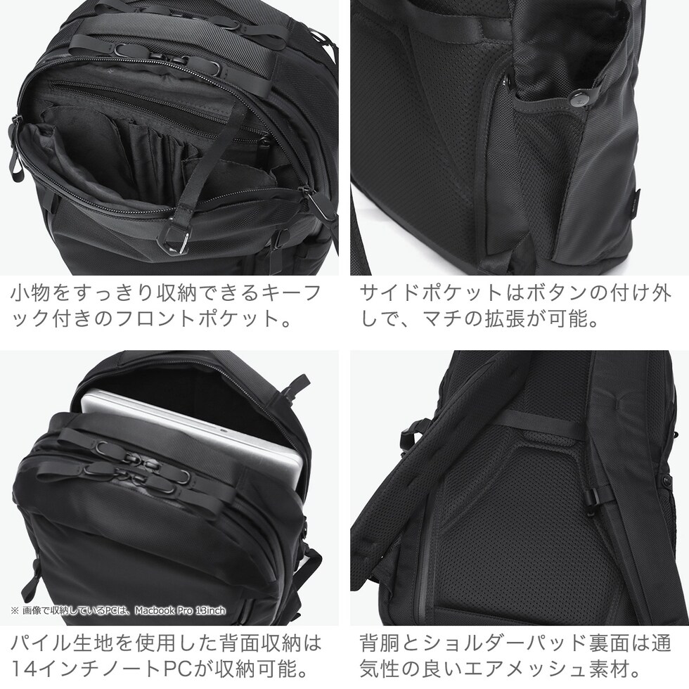 | 仕様 | <外側> PC収納×1 ポケット×7 <内側> ポケット×6 ペンホルダー×3 キーフック×1 <付属品> チェストストラップ×1 |