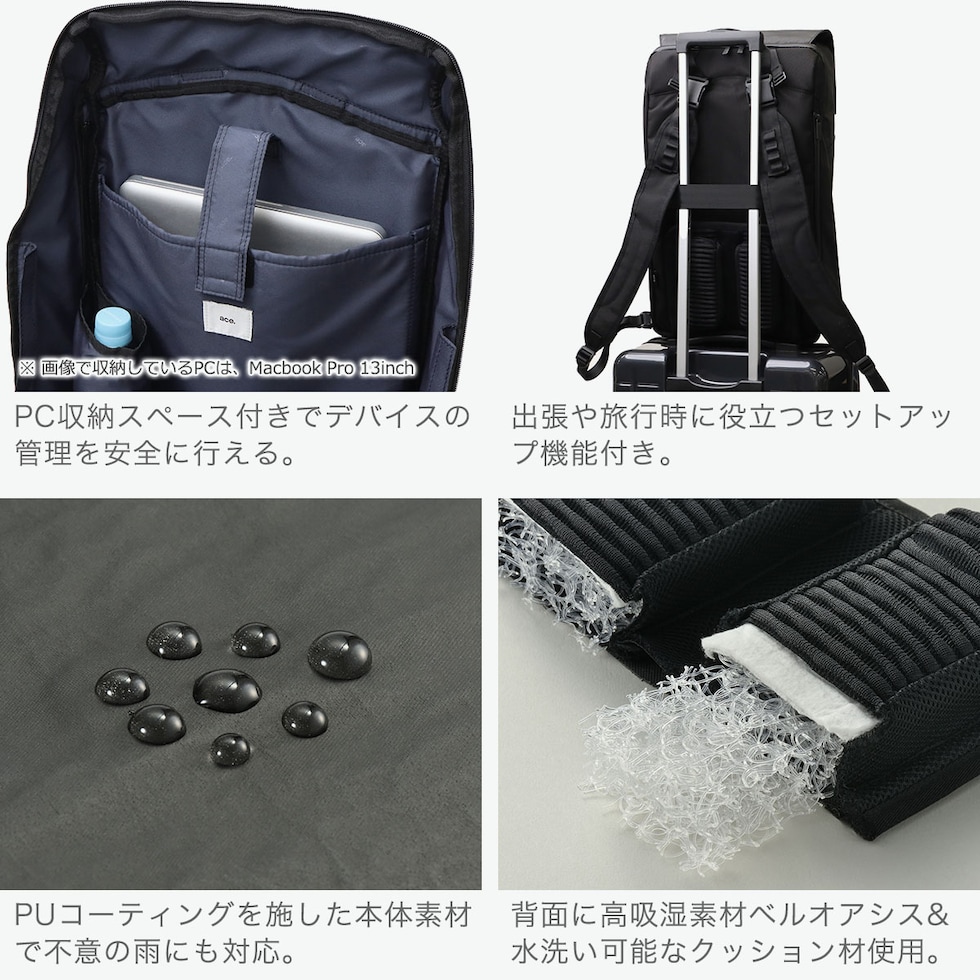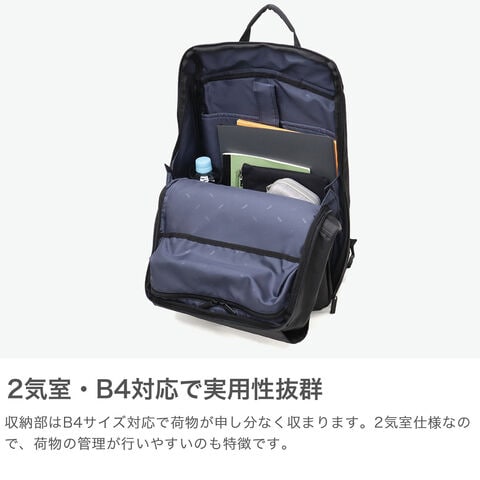 | 仕様 | <外側> ポケット×1 <内側> ポケット×6 PC収納×1 ボトルホルダー×1 ペンホルダー×2 <付属品> 背面パッド×1 リュックストラップ×1 |