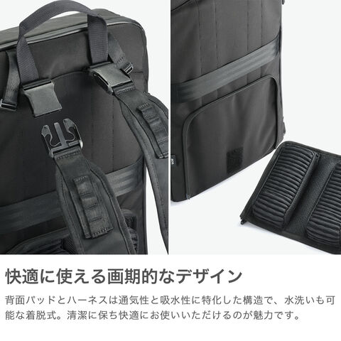 ハイスペックリュック 豪雨や高多湿への対策を考えた2ルーム仕様のコンセプトリュック。背面パッドとリュックストラップは通気性と吸水性に特化した構造で、水洗いも可能な着脱式。急な雨に対応した素材と構造に加え、通気性と洗濯可能な素材と構造で蒸れにも対応した、ハイスペックな仕上がりとなっています。 |