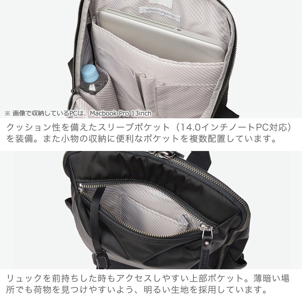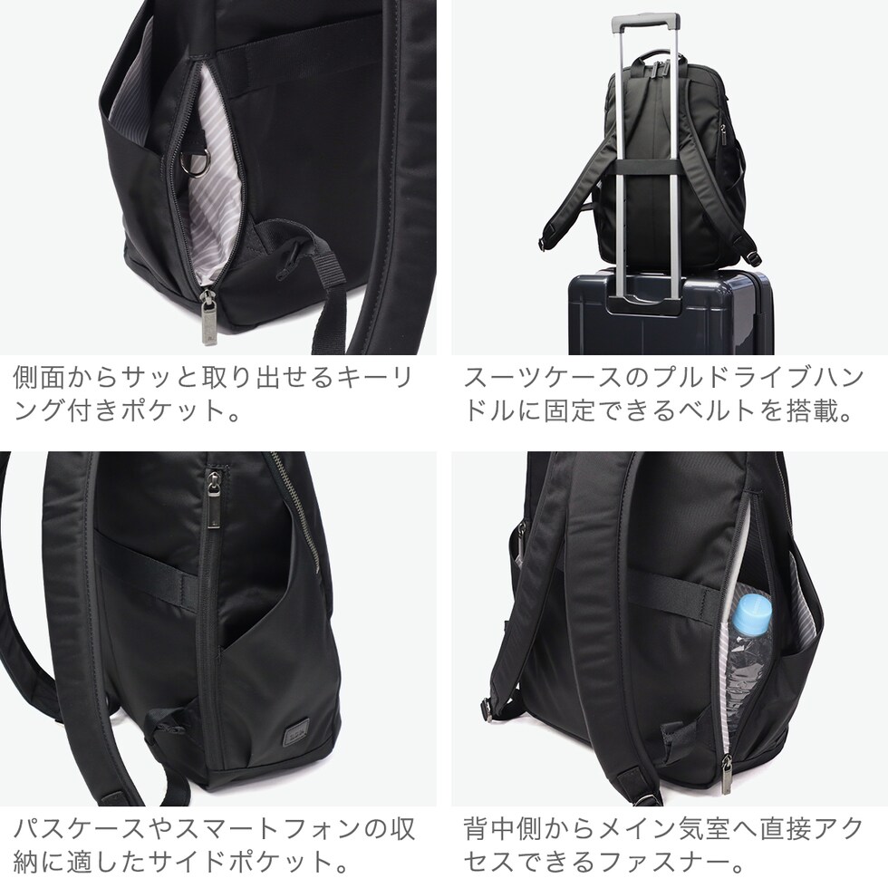 | 仕様 | <外側> ポケット×4 <内側> ポケット×4 PC収納×1 ボトルホルダー×1 ペンホルダー×1 キーフック×1 |