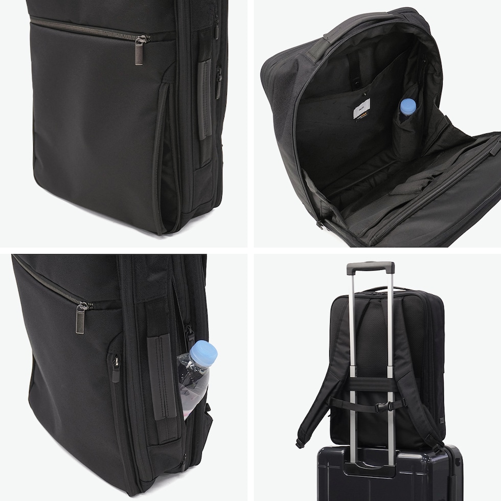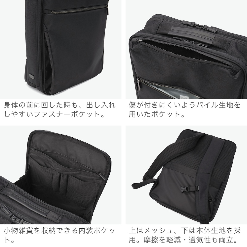 | 洗練された佇まい 仕事も旅もこれ一つ 人気のガジェタブルシリーズから、上品な印象を与えるサフィアーノ調のコーデュラ素材を使用した『ガジェタブル SF』が登場。こちらは洗練さを感じさせる本体素材に、フロントポケットの金属ファスナーを組み合わせることで、デザイン性が魅力のビジネスリュックに仕上がっています。内装にはPC収納スペースを備えた2層構造を採用し、書類やガジェット類もすっきり整理可能。通勤にも旅行にも使える、幅広いシーンで活躍します。 |