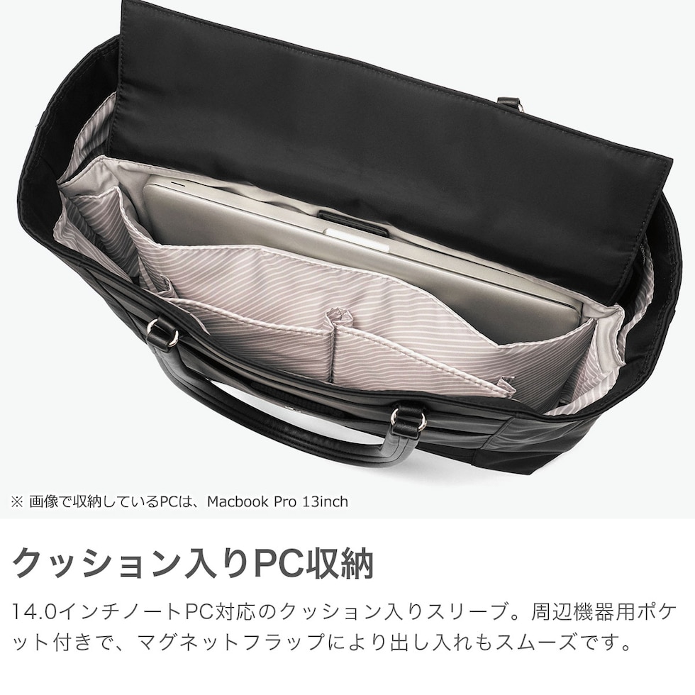 | 働く毎日に寄り添う 計算された快適設計 使い勝手を追求した通勤の決定版『フロモ』シリーズのトートバッグ。B4サイズや14インチPCが収まる2気室設計で、PC収納部には出し入れがスムーズなマグネットフラップを採用。内外に豊富なポケットとボトルホルダーを備え、荷物をすっきり整理できます。肩にやさしくなじむ柔らかなハンドルと底鋲付きで、自立も安定。セットアップ機能も備え、出張シーンにも頼れるアイテムです。 |