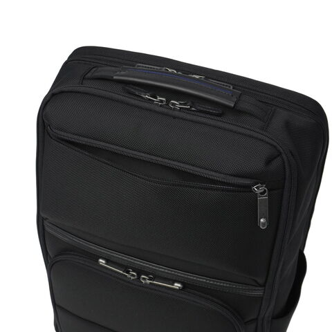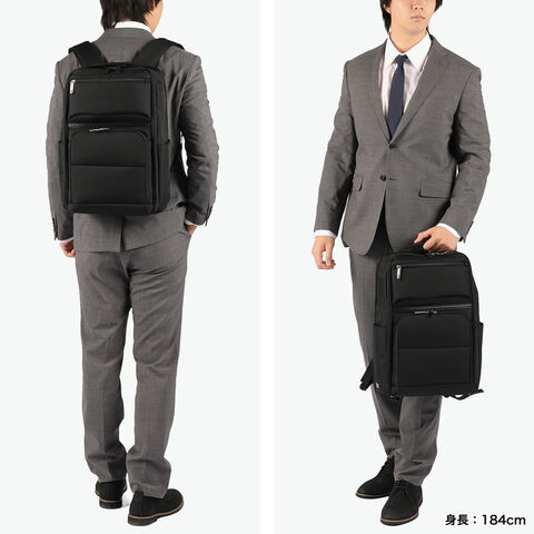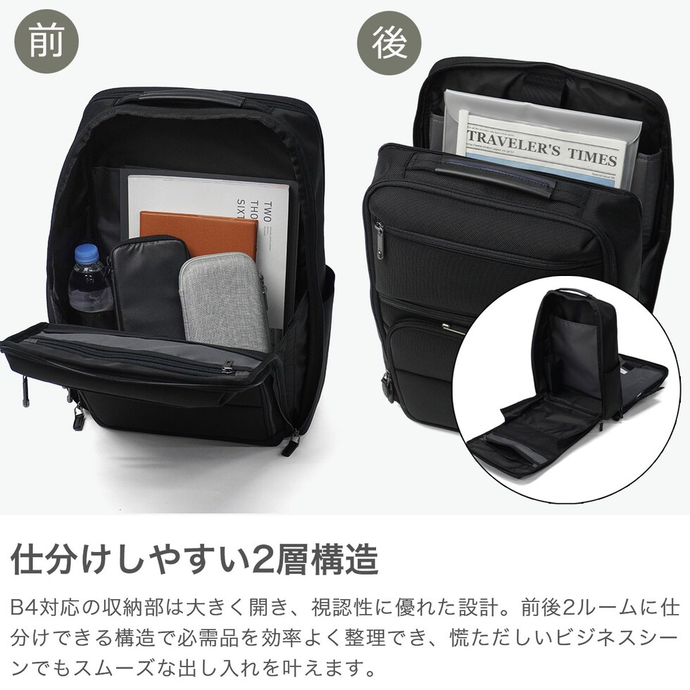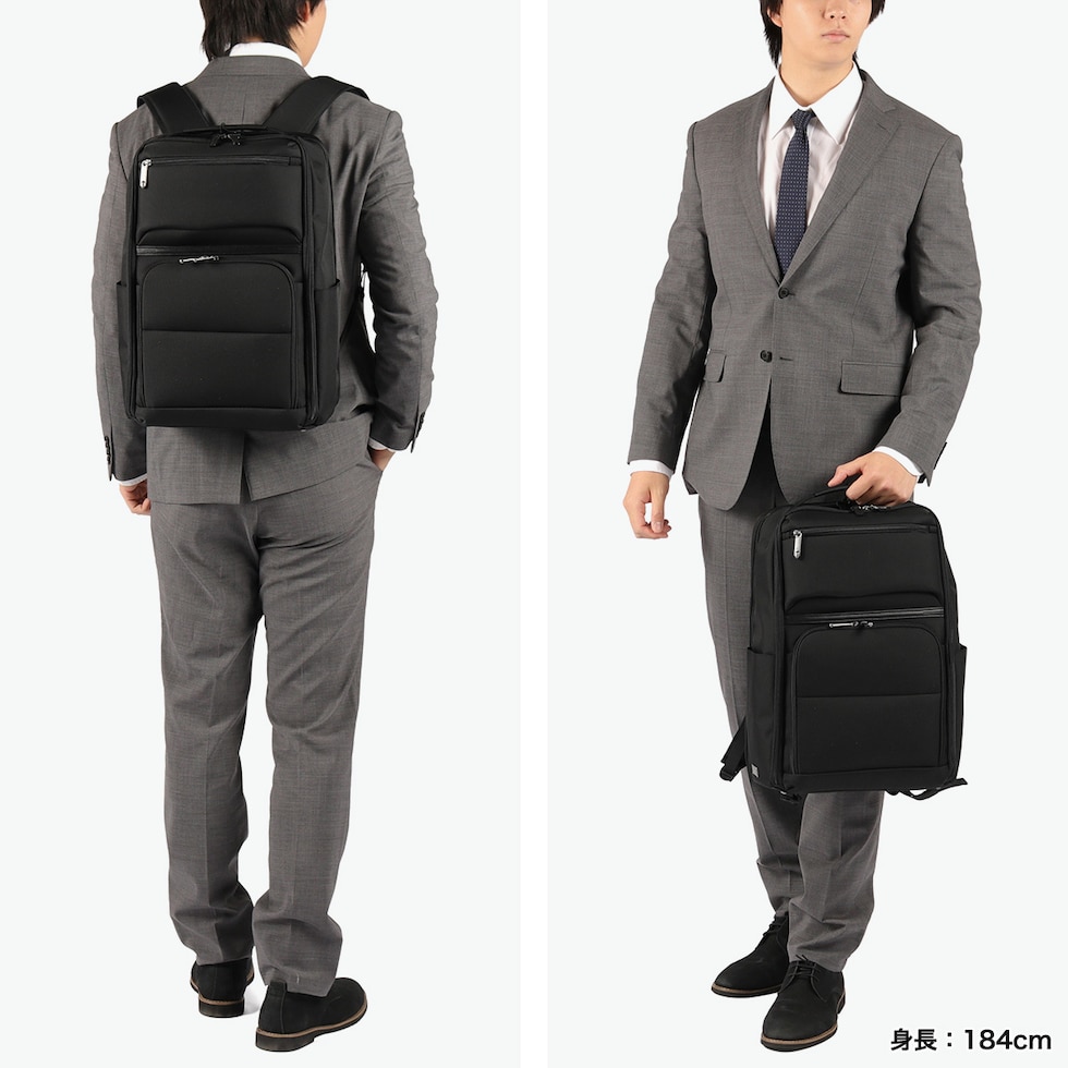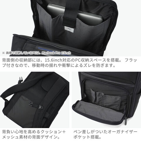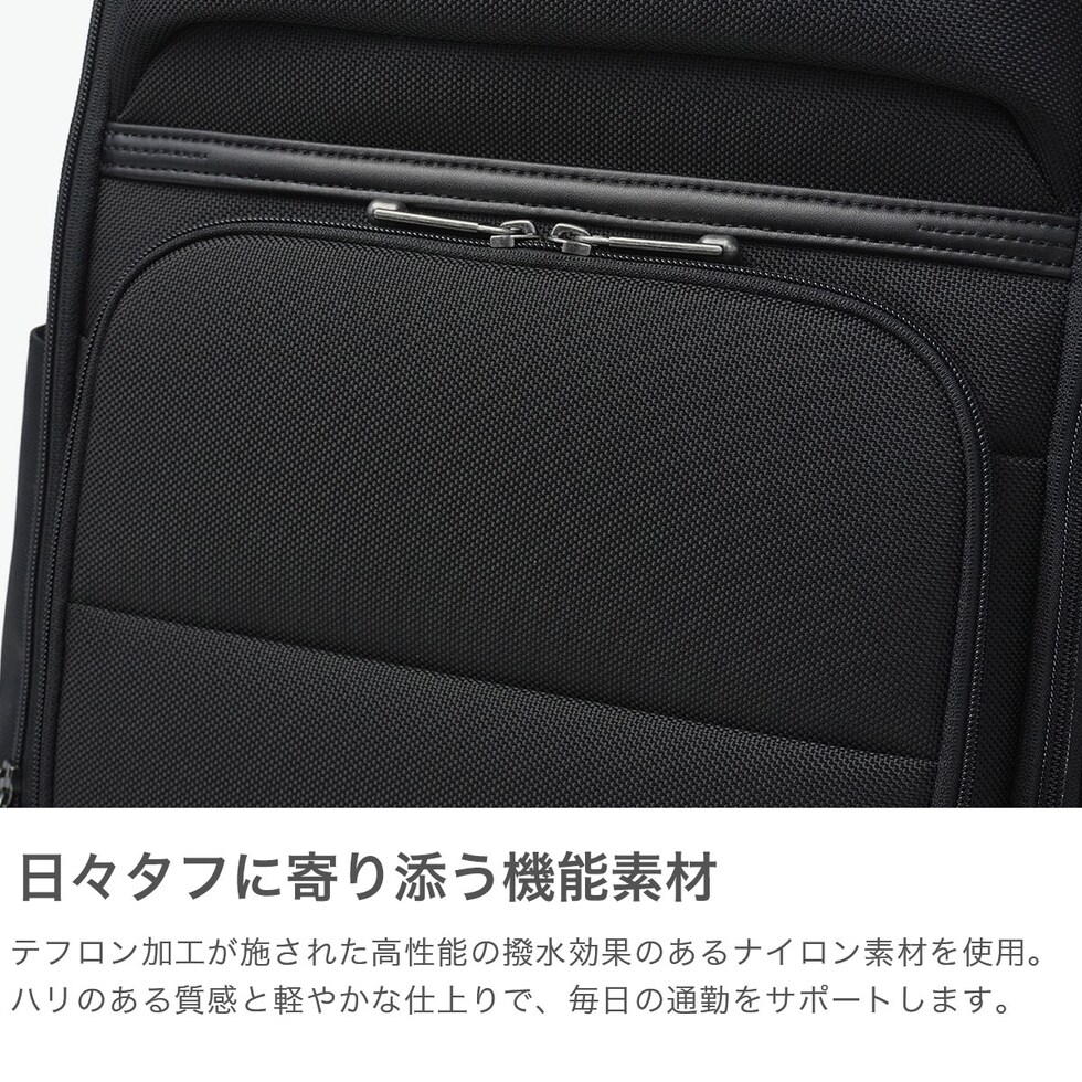 充実の機能性が魅力 無駄を削ぎ落としたミニマルな佇まいに、ビジネスに必要な機能をスマートに凝縮した『デヴェル』シリーズのリュック。すっきりとしたフォルムながら、B4サイズ対応の頼れる収納力を確保しています。15.6インチ対応のPC収納を備え、軽量かつ自立する設計に底鋲付きで扱いやすさも良好。さらに、出張時に便利なスーツケースとのセットアップ機能も搭載し、移動の多い毎日を快適にサポートします。 |