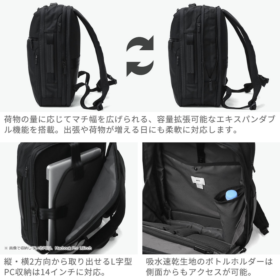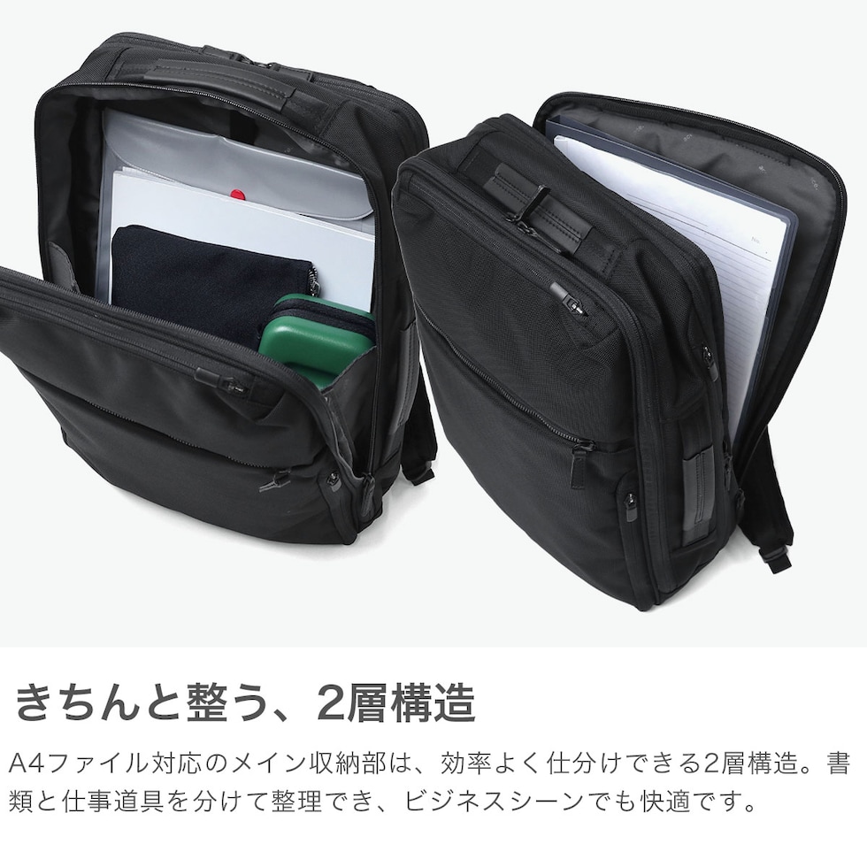 | 進化した機能美 これ一つでスマートに ベストセラーのガジェタブルCBシリーズを、ユーザーの意見を取り入れてブラッシュアップした『GADGETABLE CB2』。こちらは、15/20Lに拡張できるA4サイズ対応のビジネスリュックです。2層式となっており、14インチまでのPCを収納できるスペースを完備。出張などに便利なキャリーオン機能などビジネスシーンをサポートしてくれる機能的な仕上がりとなっています。 |