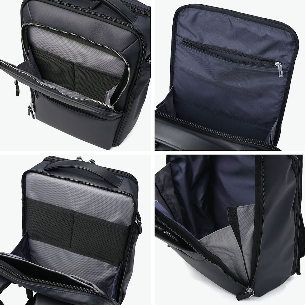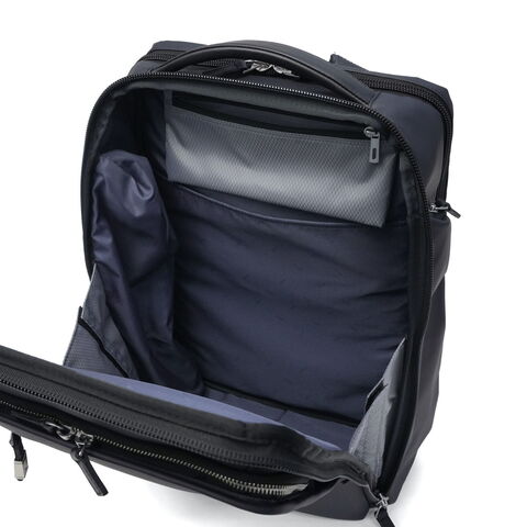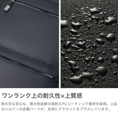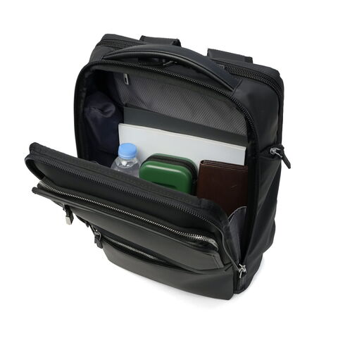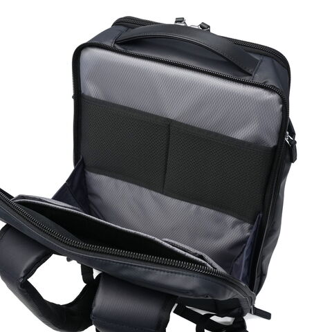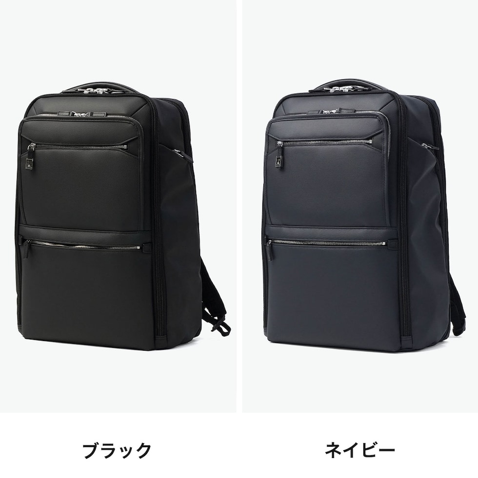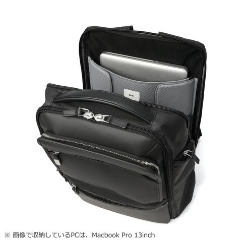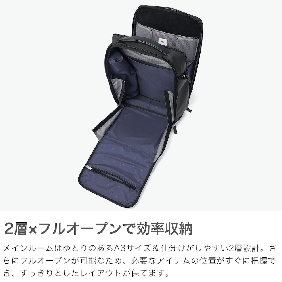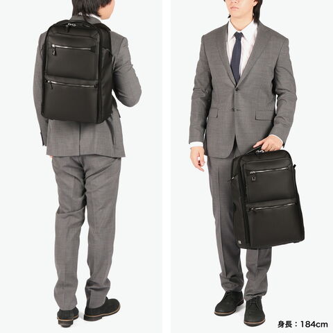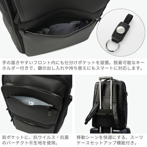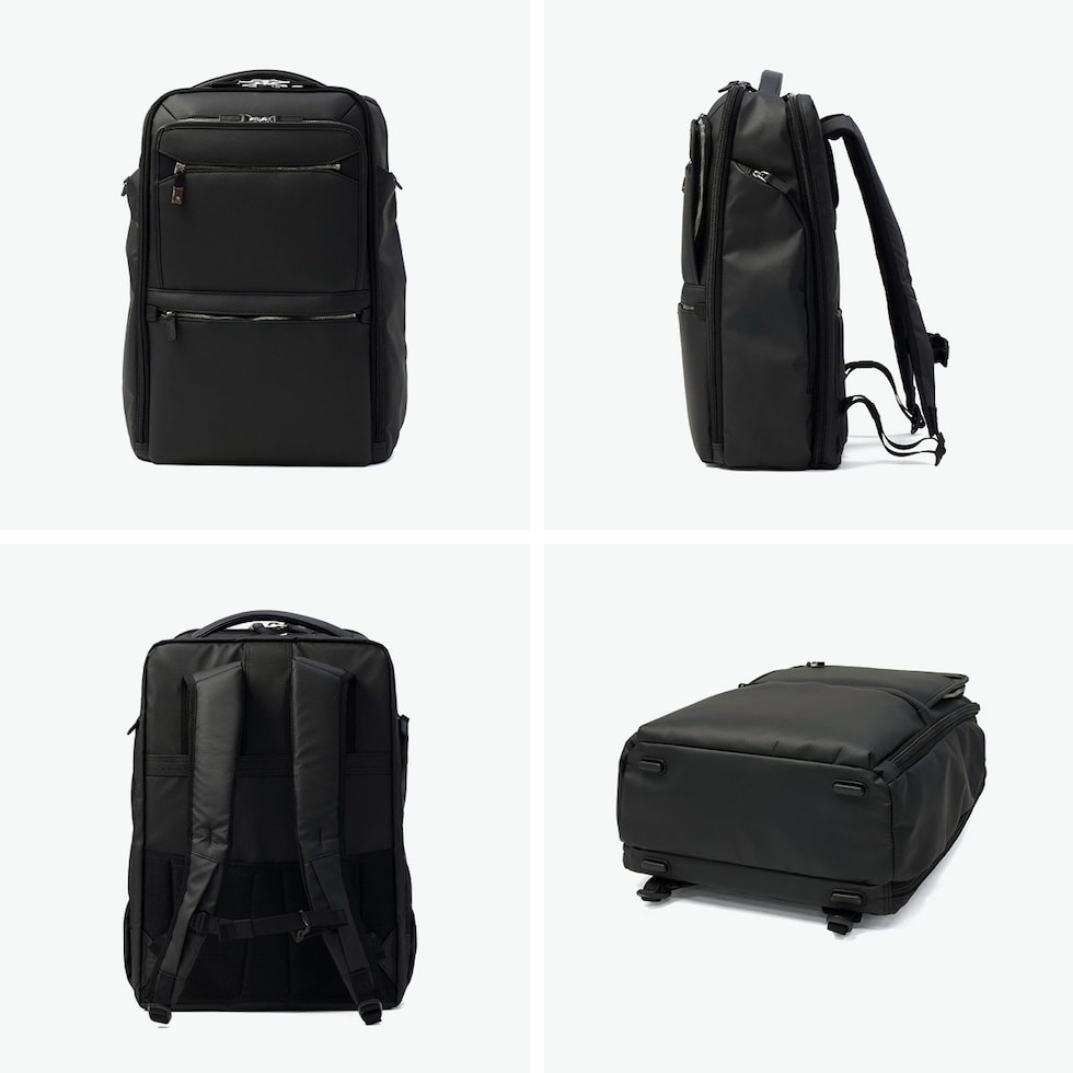 | 仕様 | <外側> ポケット×4 ボトルホルダー×1 <内側> ポケット×8 PC収納×1 ペンホルダー×2 キーフック×1 <付属品> チェストストラップ×1 |