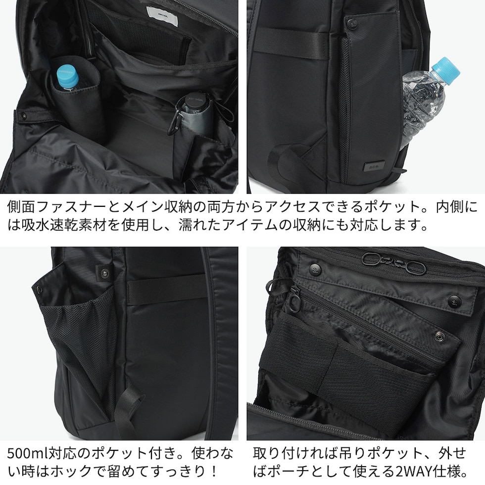 | 仕様 | <外側> ポケット×2 PC収納×1 <内側> ポケット×12 ボトルホルダー×2 ペンホルダー×2 キーフック×1 |