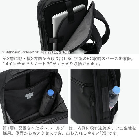 スマート設計リュック ベストセラーのガジェタブルCBシリーズを、ユーザーの意見を取り入れてブラッシュアップした『GADGETABLE CB2』。こちらは、14L容量でA4サイズ対応のビジネスリュックです。2層式となっており、14インチまでのPCを収納できるスペースを完備。出張などに便利なキャリーオン機能などビジネスシーンをサポートしてくれる機能的な仕上がりとなっています。 |