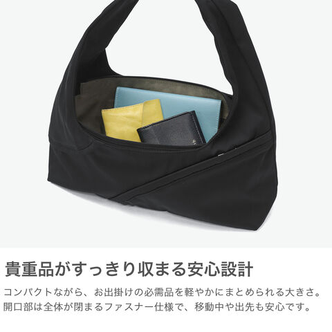 ミニマルデザインが特徴 無駄をそぎ落とし、シンプルかつ軽量に仕上げた小さめトートバッグ。落ち着きのある素材感で、カジュアルからフォーマルまで幅広いシーンで使用できます。手持ちでも肩掛けでもすっきり持てるサイズ感と、ファスナー付きで中身が見えない安心感もポイントです。 |