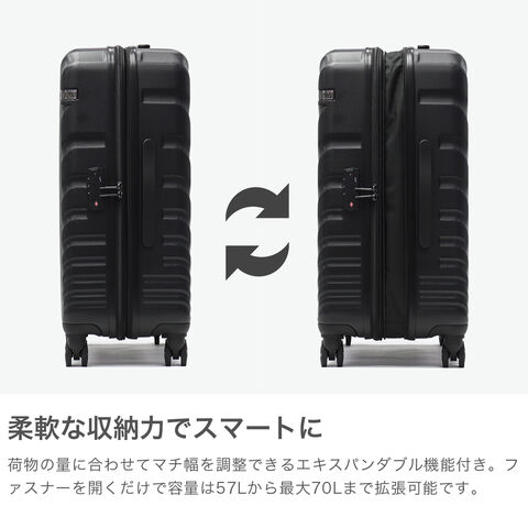 兼ね備えたつくり 荷物が増えても安心のマチ拡張機能を備えた『OVAL2/オーバル2』シリーズの57Lのスーツケースです。美しい流線型のリブデザインのボディには、衝撃に強く耐久性に優れたABS混合樹脂を採用。利便性の高い機能を備えただけでなく発色の良い鮮やかなカラーリングで、トラベルシーンを明るく彩ります。 |