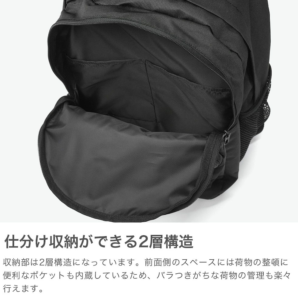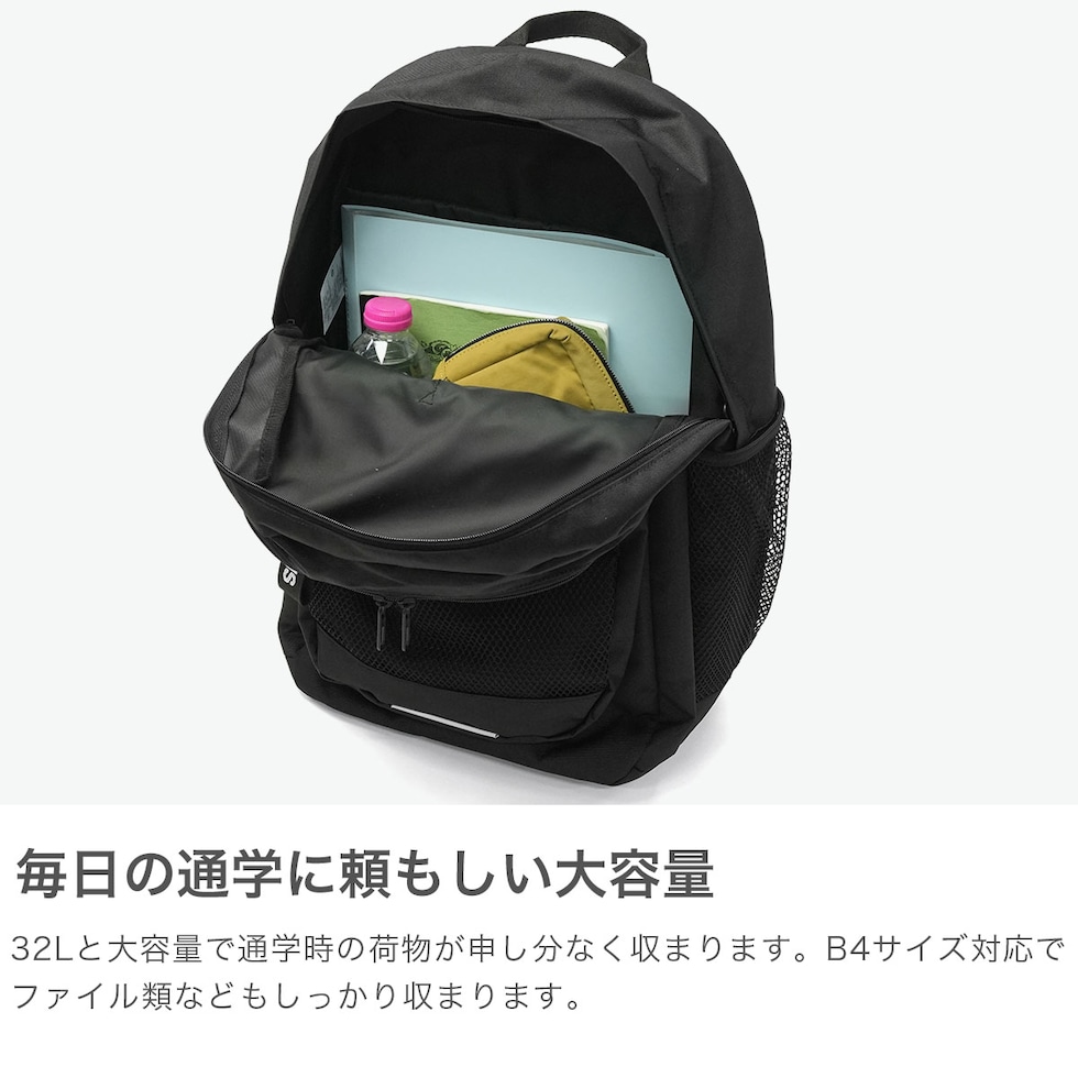 通学にも普段使いにも取り入れやすいデザインの『ESSENTIALS/エッセンシャルズ』バックパック。32Lの大容量で、3つのコンパートメントと豊富なポケットを備え、荷物をすっきり整理できます。メインルームにはPCスリーブとスリップインポケットを配置。フロントポケットやサブルームにも収納を備え、使い勝手も良好です。メッシュポケットやDリングで推し活カスタマイズも可能。前後のリフレクターやチェストベルト付きで通学や部活、旅行にも活躍します。