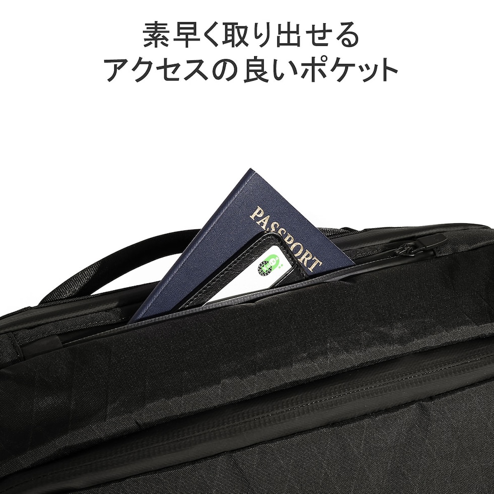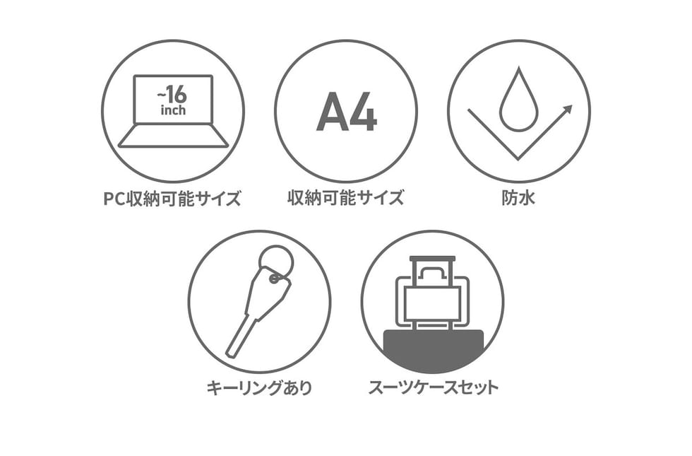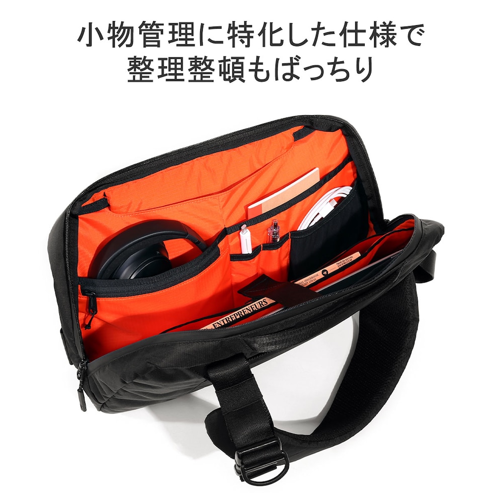 | 仕様 | <外側> ジップポケット(L)×1 └ 内蔵 ポケット(M)×2 キーフック×1 ジップポケット(S)×1 <内側> PC収納×1 ポケット(L)×1 ベルクロポケット(M)×1 ジップポケット(S)×1 ポケット(S)×2 メッシュポケット(XS)×1 ペンホルダー×2 |