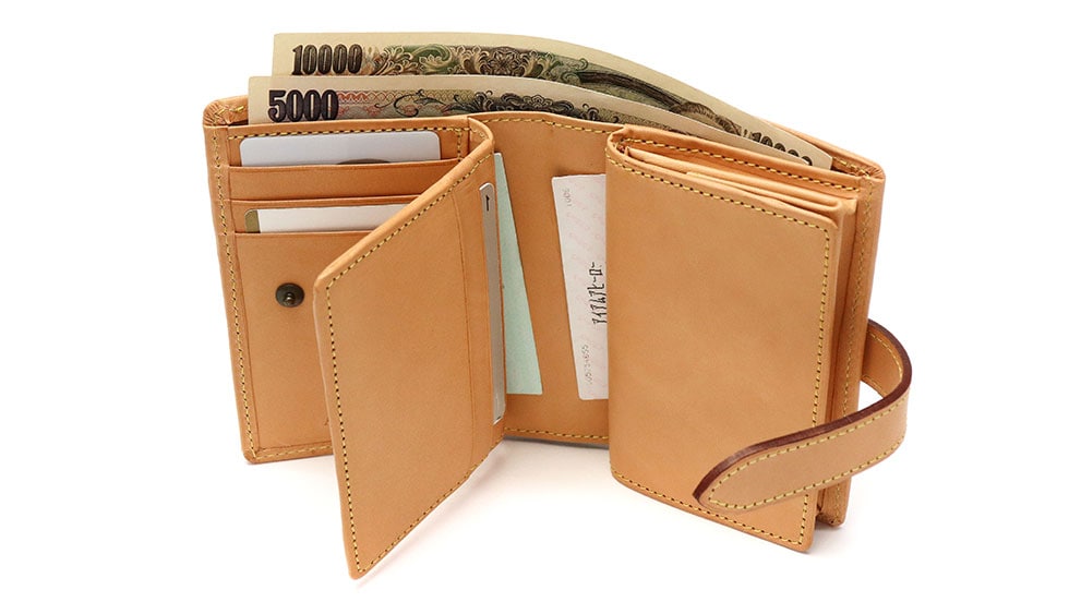 本体には、仕切り付きで種別管理ができる札入れや小銭入れ、領収書やチケット類の管理に役立つフリーポケットを装備。さらに、中ベラを設けることにより、カードは9ヶ所にしまうことができます。小ぶりながら頼もしい収納力を備えたつくりが魅力的です。