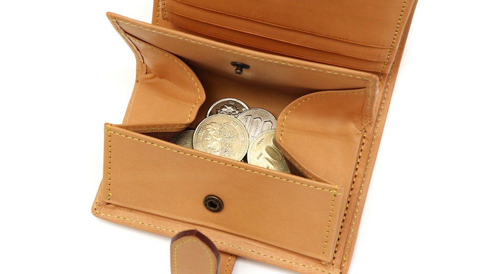 スナップホックで簡単に開閉できる小銭入れはboxタイプ。収納部分がパカッと大きく開き、容量と内部の可視性のどちらにも優れている所が魅力となっています。