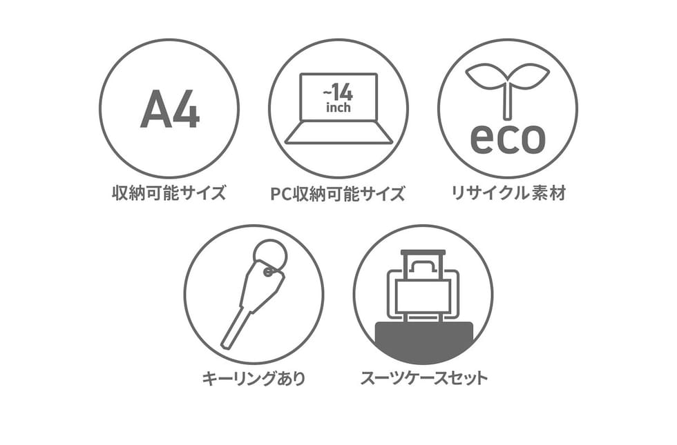 | 仕様 | <外側> PC収納×1 ジップポケット(M)×1 └ 内蔵 ポケット(S)×2 マグネットポケット(M)×1 ポケット(S)×1 └ 内蔵 キーフック×1 ポケット(S)×2 <内側> ポケット(M)×2 メッシュジップポケット(M)×1 |