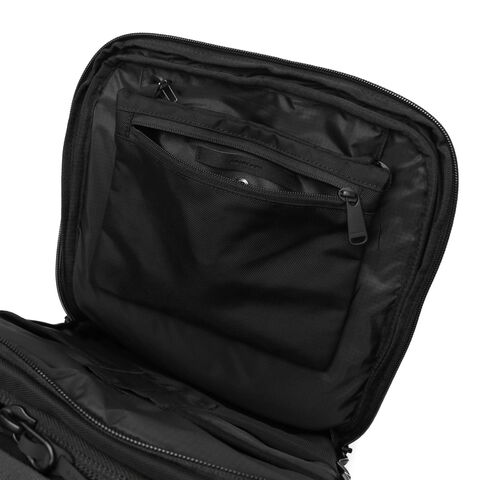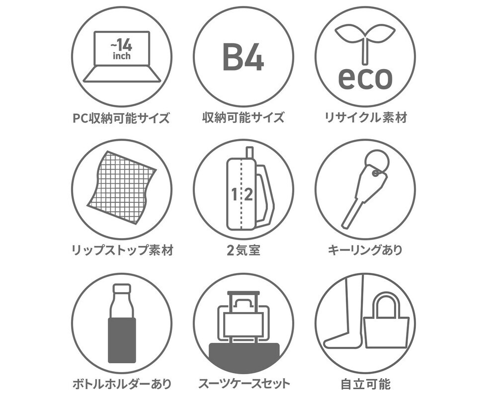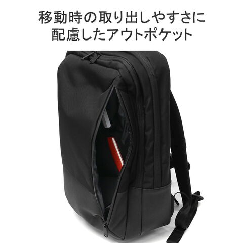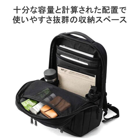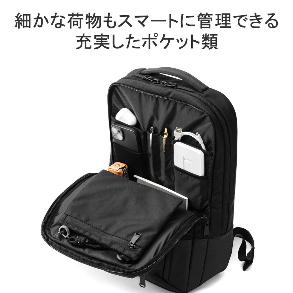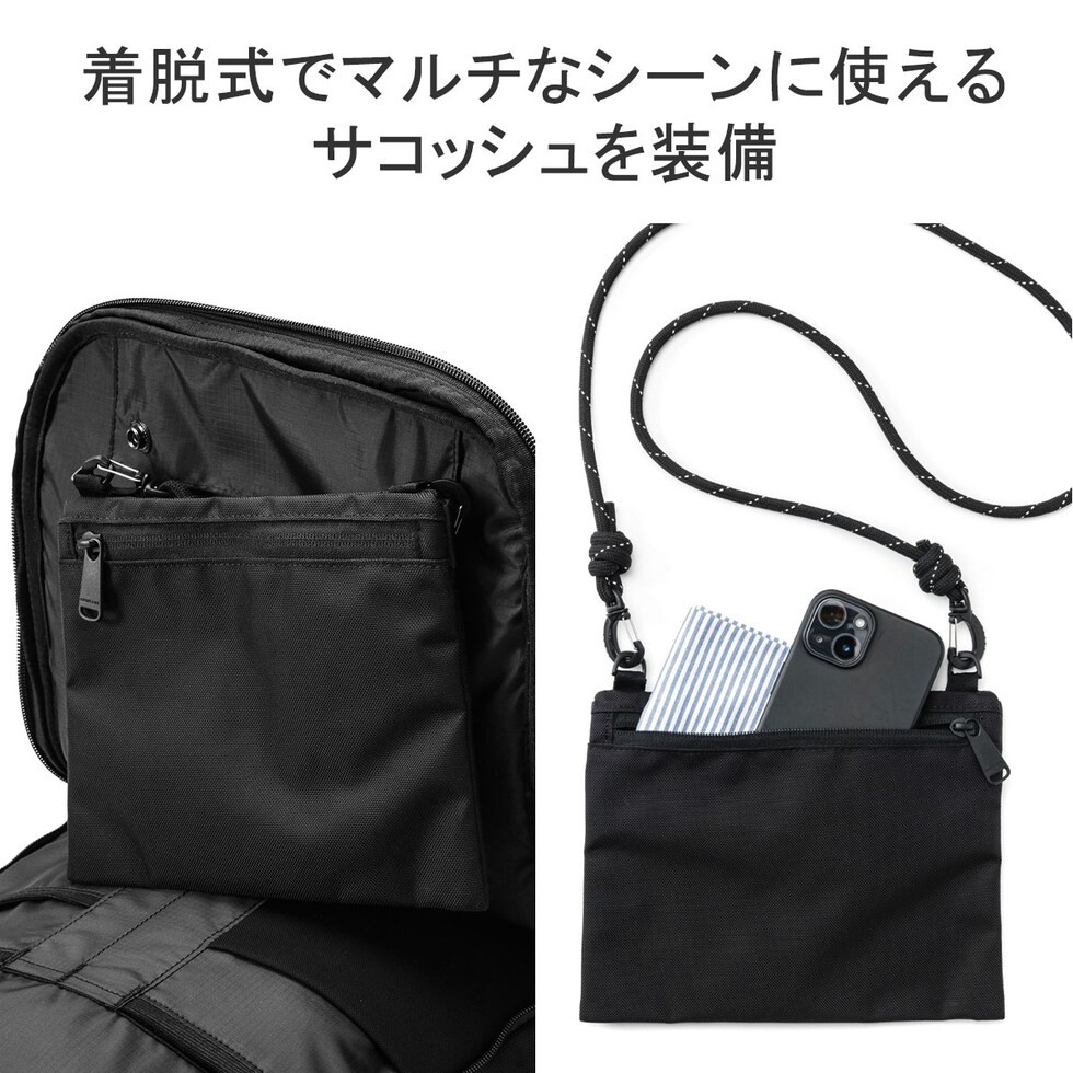 | 仕様 | <外側> ジップポケット(L)×1 └ 内蔵 ポケット(M)×3 キーフック×1 ジップポケット(S)×1 <前面収納> ポケット(S)×3 メッシュポケット(S)×1 ペンホルダー×2 サコッシュ×1(取り外し可能) <背面収納> PC収納×1 タブレット収納×1 メッシュジップポケット(M)×1 ボトルホルダー×2 |