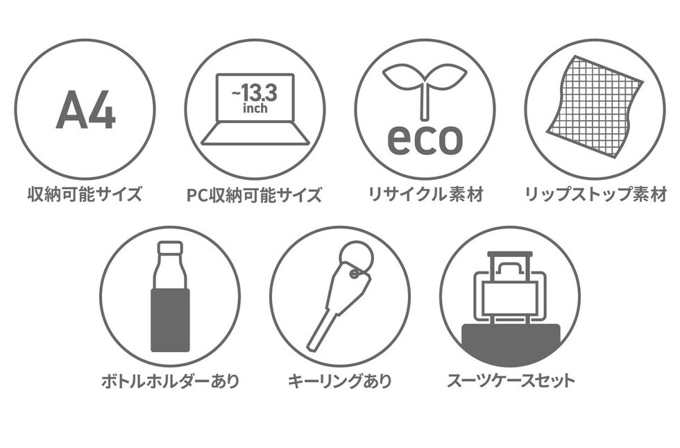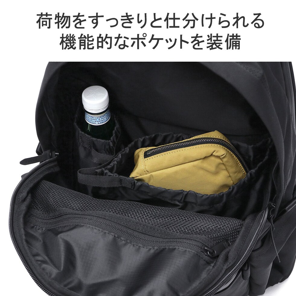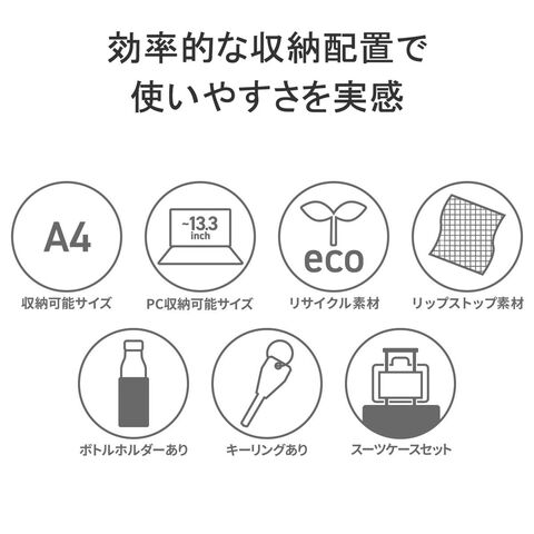| 仕様 | <外側> PC収納×1 ジップポケット(M)×1 └ 内蔵 ポケット(S)×2 マグネットポケット(M)×1 ジップポケット(S)×1 ポケット(S)×1 └ 内蔵 キーフック×1 ポケット(S)×1 <内側> ポケット(M)×1 メッシュジップポケット(M)×1 ボトルホルダー×1 |