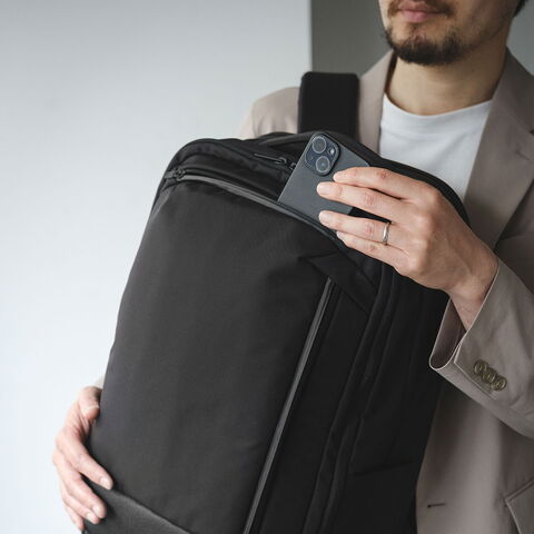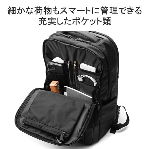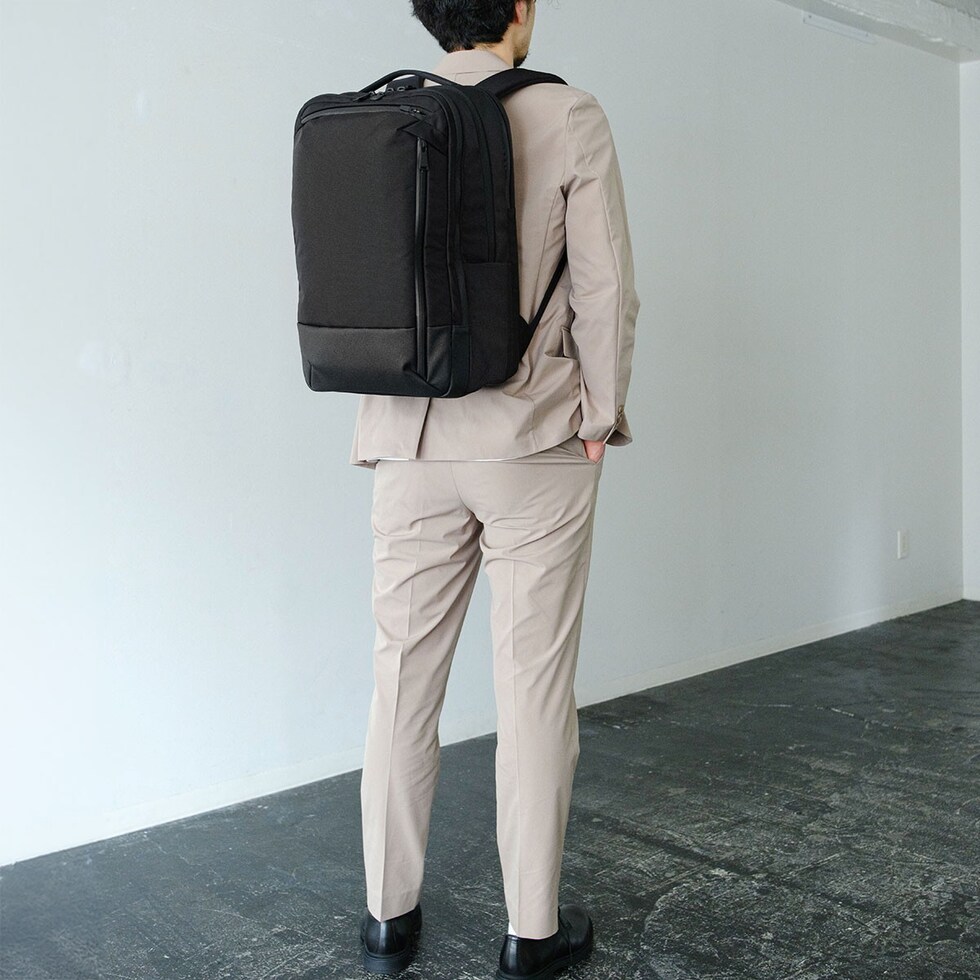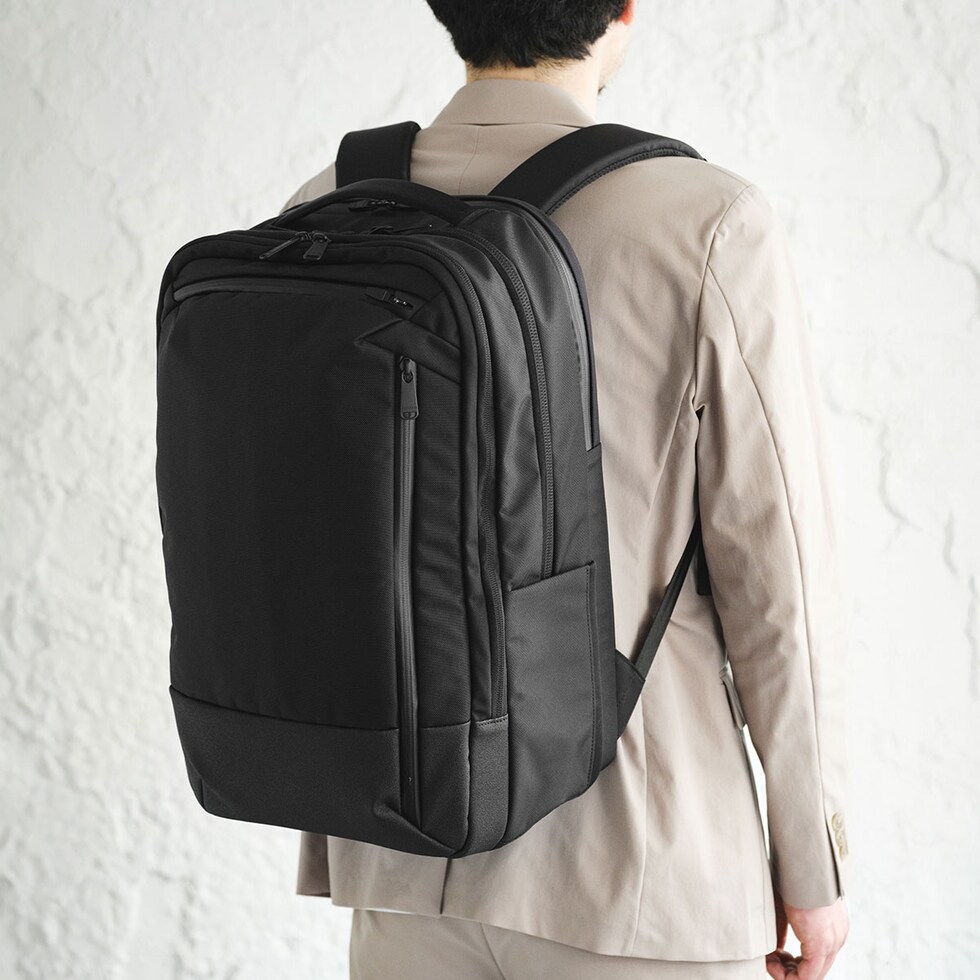 | 収納力と利便性を備えた 頼れる相棒リュック ビジネスマンが持ち歩くアイテムをリサーチし、何をどこにしまうか計算しつくされた収納配置が魅力の3層式リュック。PCやタブレットが2台同時に収納できる仕様や、キャリーオンが可能な装備などビジネスシーンで役立つ機能が満載の仕上がりに。名だたるブランドの企画・生産を手掛けた老舗バッグメーカーが考え抜いた至高の一品です。 |
