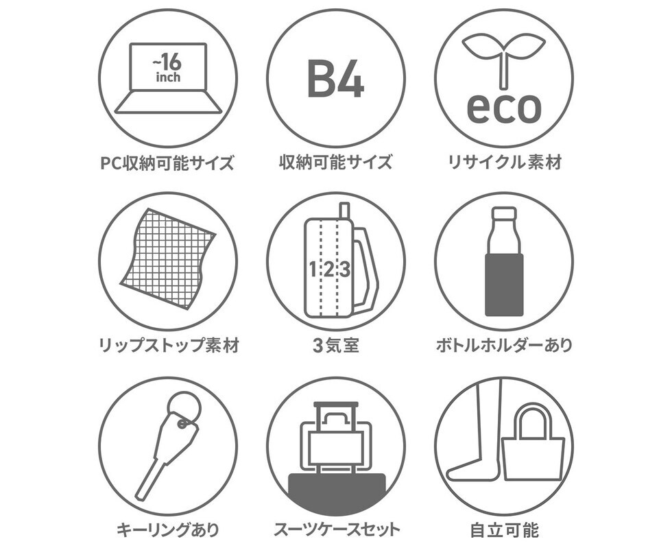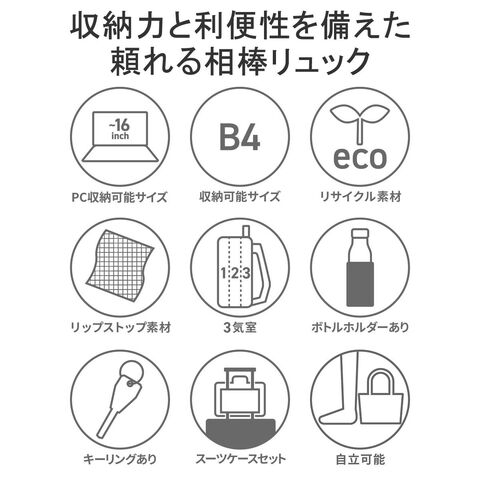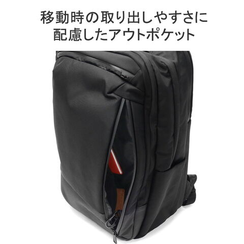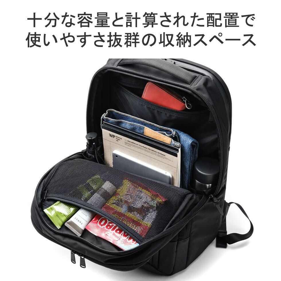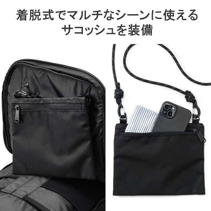 | 仕様 | <外側> ジップポケット(L)×1 └ 内蔵 ポケット(S)×2 キーフック×1 ジップポケット(M)×1 ポケット(S)×2 <前面収納> ポケット(S)×2 ポケット(XS)×1 メッシュポケット(XS)×1 ペンホルダー×2 サコッシュ×1(取り外し可能) <中央収納> ジップポケット(M)×1 メッシュジップポケット(M)×1 ボトルホルダー×2 <背面収納> PC収納×2 |