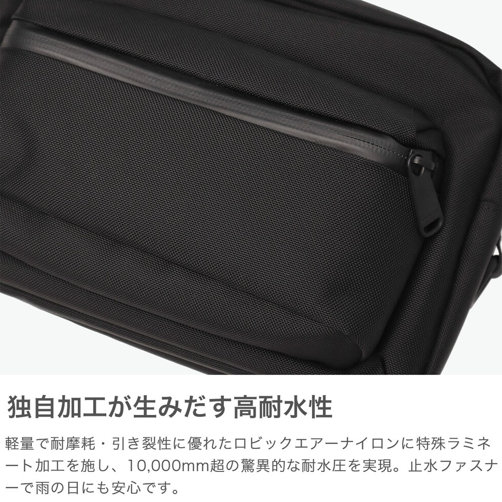 迷いを減らし、生産性を高めるためのプロダクトをめざしたボディバッグ。 Robic Airナイロンと防水メンブレンによる耐水圧10,000mmの高機能ファブリックを採用し、耐摩耗性・耐引裂性・軽量性を高次元で両立。プロフェッショナルの現場に求められる合理性と快適性を併せ持つ、ANINSANEを象徴するハイパフォーマンスシリーズです。