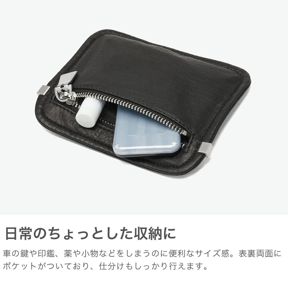 “世界一柔らかい革”を目指して作られた素材「Reality Leather」を使用した、マチなしの薄型ポーチ。両面にファスナーを備え、中身を安心して収納できるため、持ち物をすっきり整理できます。バッグ内での仕分け用はもちろん、そのままリビングに置いても馴染むシンプルデザインも魅力。車の鍵や印鑑・カードなどを分けて収納でき、薬や小物の整理にも便利な収納アイテムです。