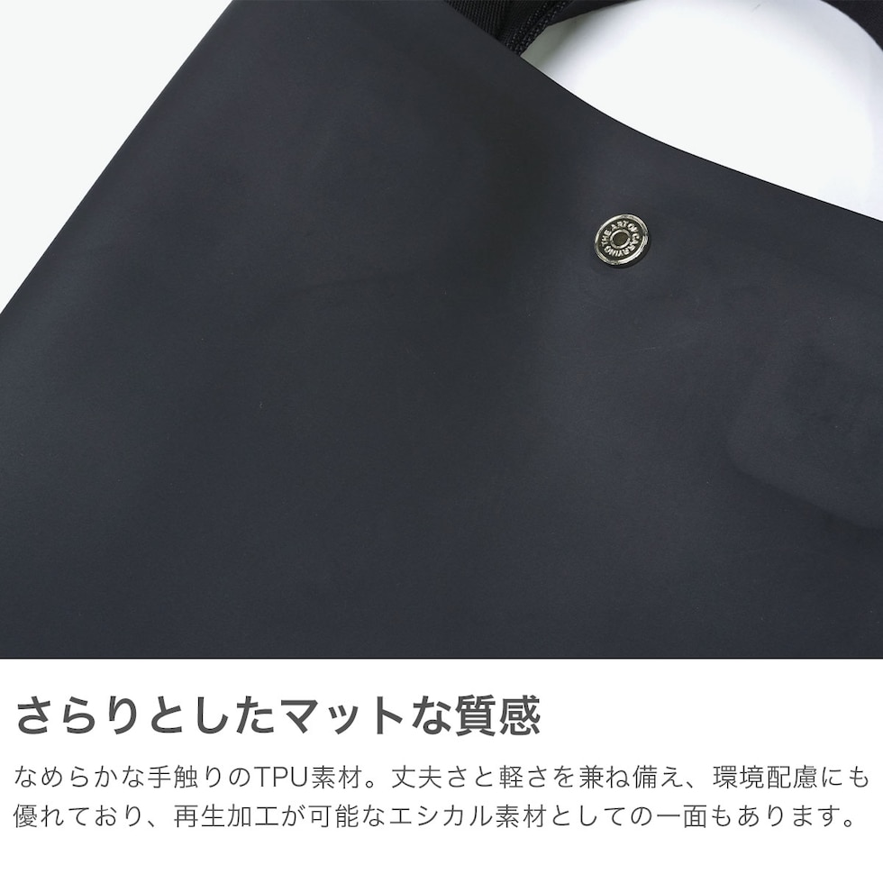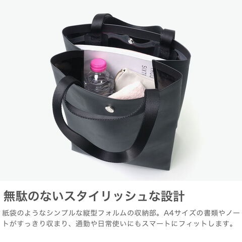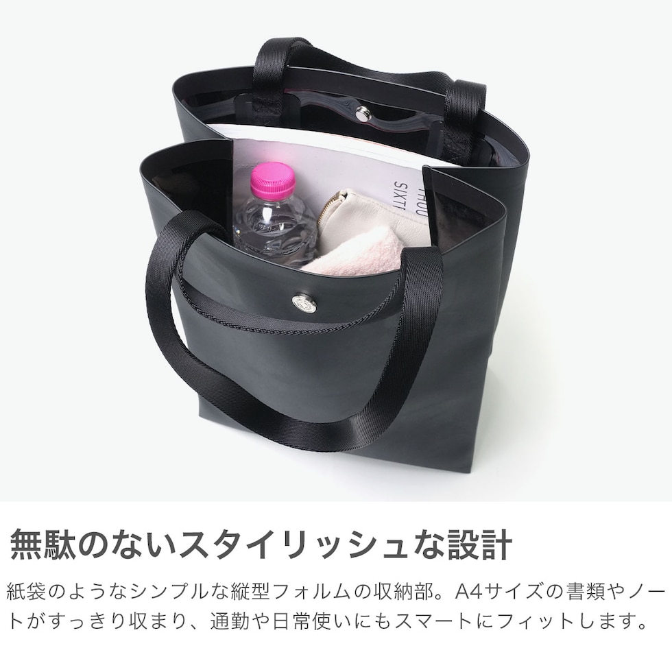 | シンプルかつ洗練された ミニマル構造で魅せる 紙袋という最小構造から着想を得て、現代のライフスタイルに再構築した2WAYトートバッグ。ノンステッチで仕立てたミニマルな佇まいが、品のある静けさと洗練を纏わせます。カーフレザーのようなマットで上質な表情ながら、実は軽量かつ完全防水。傷や摩擦にも強い素材で、急な雨の日も安心です。A4サイズの書類がすっぽり収まる容量で、通勤や移動の多い日常にもフィット。肌当たりがやさしいため、身体に自然と寄り添い、荷物が多くてもストレスなく持ち運べます。 |