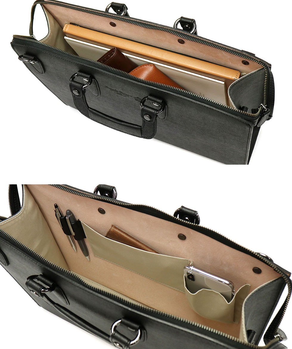 メイン収納部は書類やファイルの収納にちょうど良いA4対応サイズ。マチを設けているため、眼鏡ケースなど厚みのあるアイテムも収納可能。ポケットは内側のみに設けたスマートなルックスです。メモ帳やペンなど、ビジネスに必要な小物アイテムも効率よく管理していただけます。