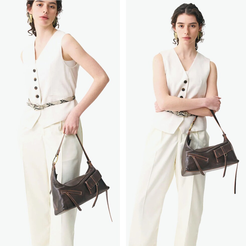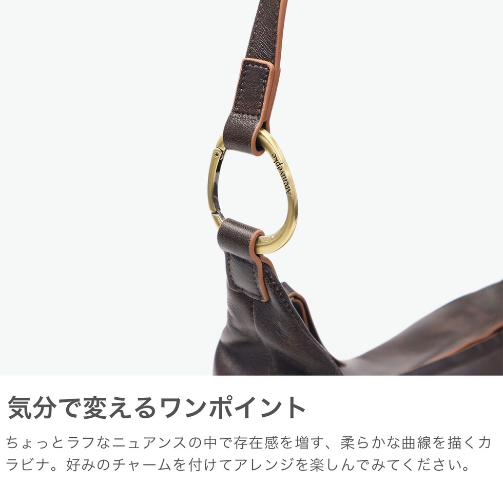人とは違うデザインが◎ ウォッシュ加工を施すことで演出したちょっとラフなニュアンスが特徴のショルダーバッグ。柔らかな曲線を描くカラビナがポイント。マルチポケットデザインで収納力も高めています。ストラップの長さも調整が可能で、肩掛けでも、短く持って手持ちスタイルでも可愛くきまります。カラビナに好みのチャームを付けてアレンジを楽しめるので、さりげなく個性をアピールしたい方にもおすすめです。 |