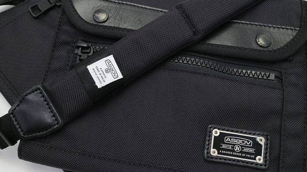 本体素材にはタテ糸に1000d、ヨコ糸に840dの66ナイロン糸を使用したオリジナルのコーデュラバリスティックナイロンを採用。また、付属レザーには環境にも人体にも優しいヌメレザーを使用。経年変化を楽しめるAS2OVオリジナルネームも魅力的です。