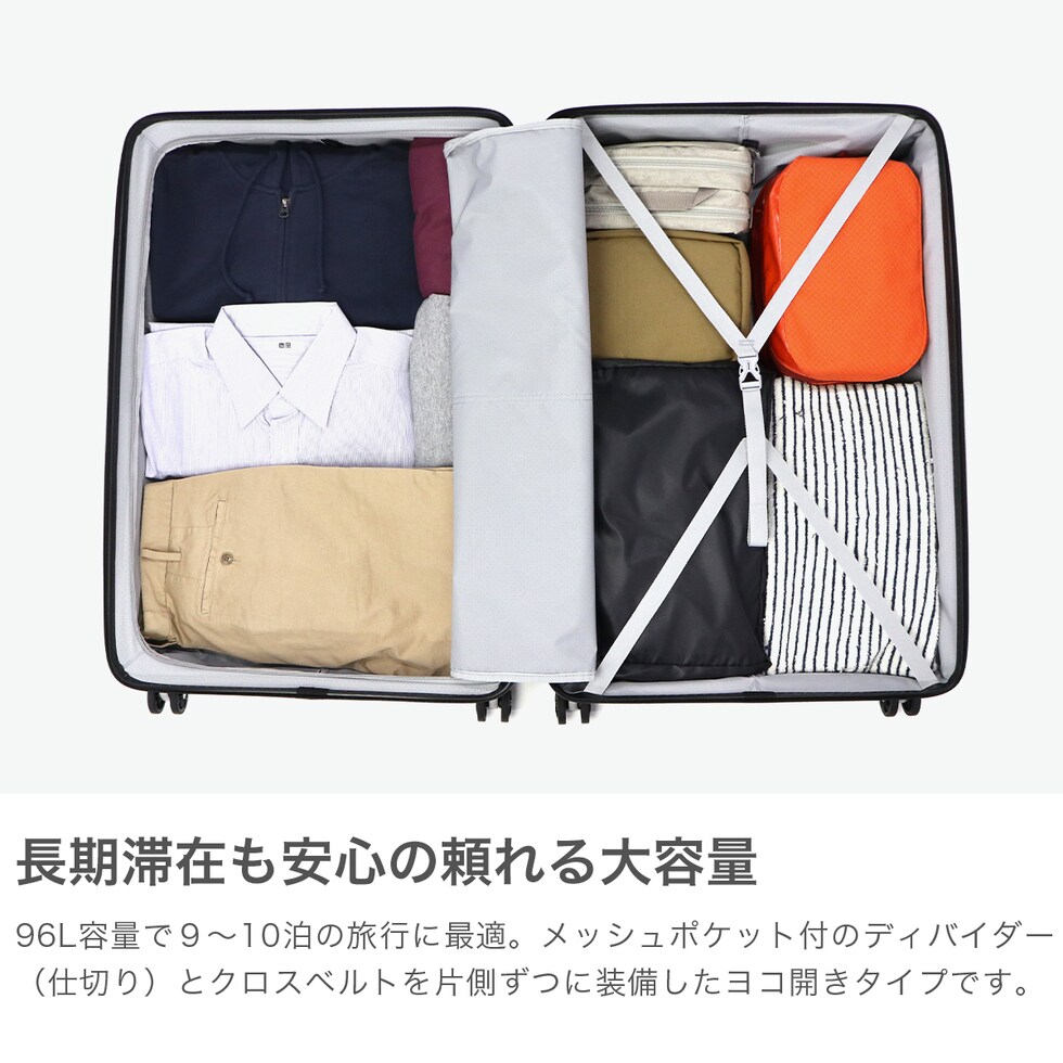 | 大容量でも軽快 長旅をもっと快適に 高純度ポリカーボネート100%を採用し、軽量ながら耐久性に優れた軽量フレームハードキャリー「Mgical louis / マジカルイス」にジッパータイプが登場!こちらは9~10泊の長期旅行に対応する96Lの大容量サイズ。スムーズな双輪キャスターとTSAロック付きで移動も安心。シンプルで洗練されたデザインが、大人の旅をスマートに演出します。 |