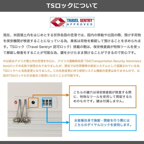 | <購入前にご確認ください> ・メーカーの意向により、付属品の収納袋や箱、製品の仕様やデザインは予告なく変更となる場合がございます。 ・下記による返品・交換はお受けすることができませんので、予めご了承ください。 └ 製品の性質上による細かいキズや塗装ムラ、気泡などがある場合。 └ 配送用の段ボールにキズ、汚れ、破損がある場合。 ・エキスパンダブル機能付きの製品は、マチ拡張時の3辺の和が機内持ち込みサイズ、預け入れ無料サイズを超える場合がございます。また、航空会社や飛行機の機種などによって規定が異なりますので、予めご確認の上お求めください。 ※機内持ち込みサイズ目安表はこちら ・水濡れ(雨・汗など)や日焼けにより、色落ち、退色する恐れがございます。商品のお取り扱いには十分にご注意ください。 ・柄の位置やカラーバランスなどは、生地の裁断や製造過程、素材の特性により画像とは異なる場合がございます。商品をお選びすることはできませんので、予めご了承ください。 ・極力実物に近い色味を再現しておりますが、モニター等の条件により画面上と実物では色味が異なって見える場合がございます。 |