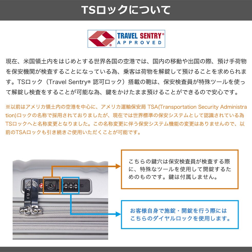 ・エキスパンダブル機能付きの製品は、マチ拡張時の3辺の和が機内持ち込みサイズ、預け入れ無料サイズを超える場合がございます。また、航空会社や飛行機の機種などによって規定が異なりますので、予めご確認の上お求めください。