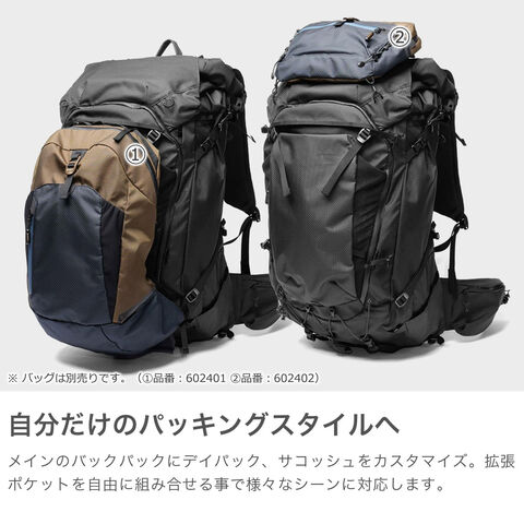 | 自分仕様を作り上げる パッキングシリーズ メインのバックパックにデイパック、サコッシュをトレッキングをはじめキャンプや旅行など、あらゆるアクティブなシーンに合わせてカスタマイズできるパッキングシリーズ『EPIC SERIES』。シリーズのメインとなるバックパックは、単体でも高い機能性と収納力を備えていますが、シリーズの各アイテムをバックパックに取り付けることができ、更に機能を拡張させることが出来ます。 |