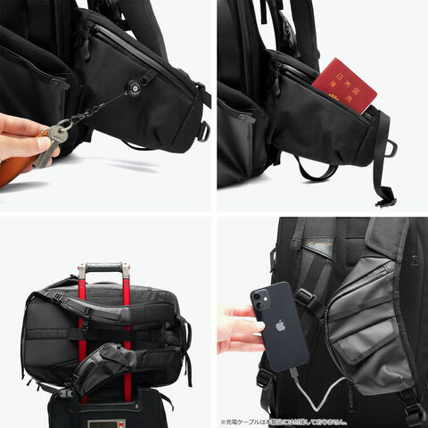 | 仕様 | <外側> ポケット×6 ボトルホルダー×1 USBポート(Type-C)×1 <内側> ポケット×14 PC収納×1 ペンホルダー×1 キーフック×1 ケーブルバンド×1 |