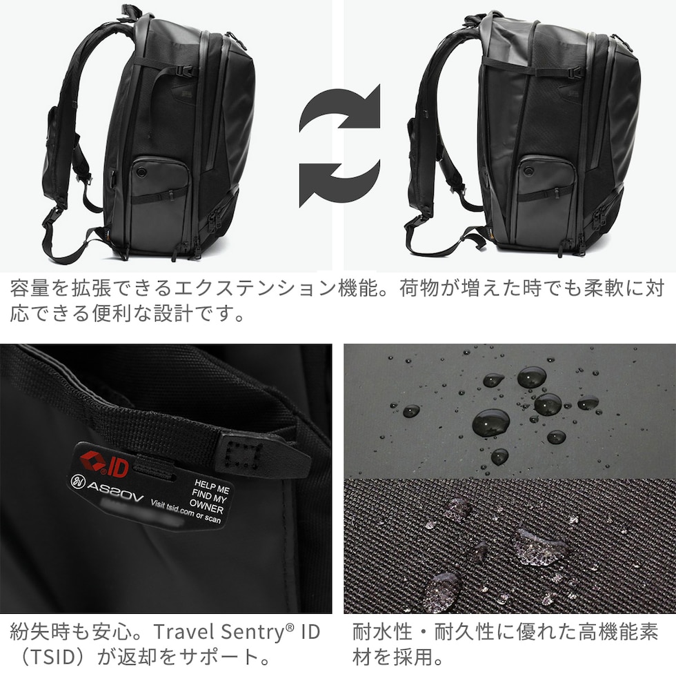 機能性抜群のリュック 出張先での観光や休日の街歩きまで、1泊~2泊程度の旅を想定して設計されたミドルサイズのバックパックです。軽量ながら高い耐水性・耐久性を誇るオリジナルファブリックを採用し、ノートPCやタブレット、充電ケーブルなどのガジェット類を整理できる専用ポケット、衣類のパッキングに適したメインルーム、キャリーオン機能まで備え、ビジネスバッグとしても旅行バッグとしても活躍。最大約5Lの拡張機能により余裕の収納力を発揮するのも魅力です。 |