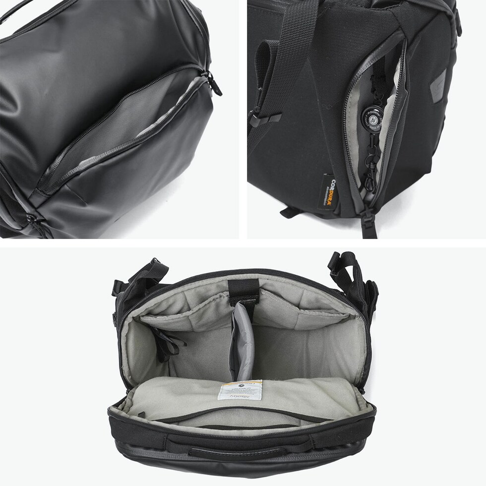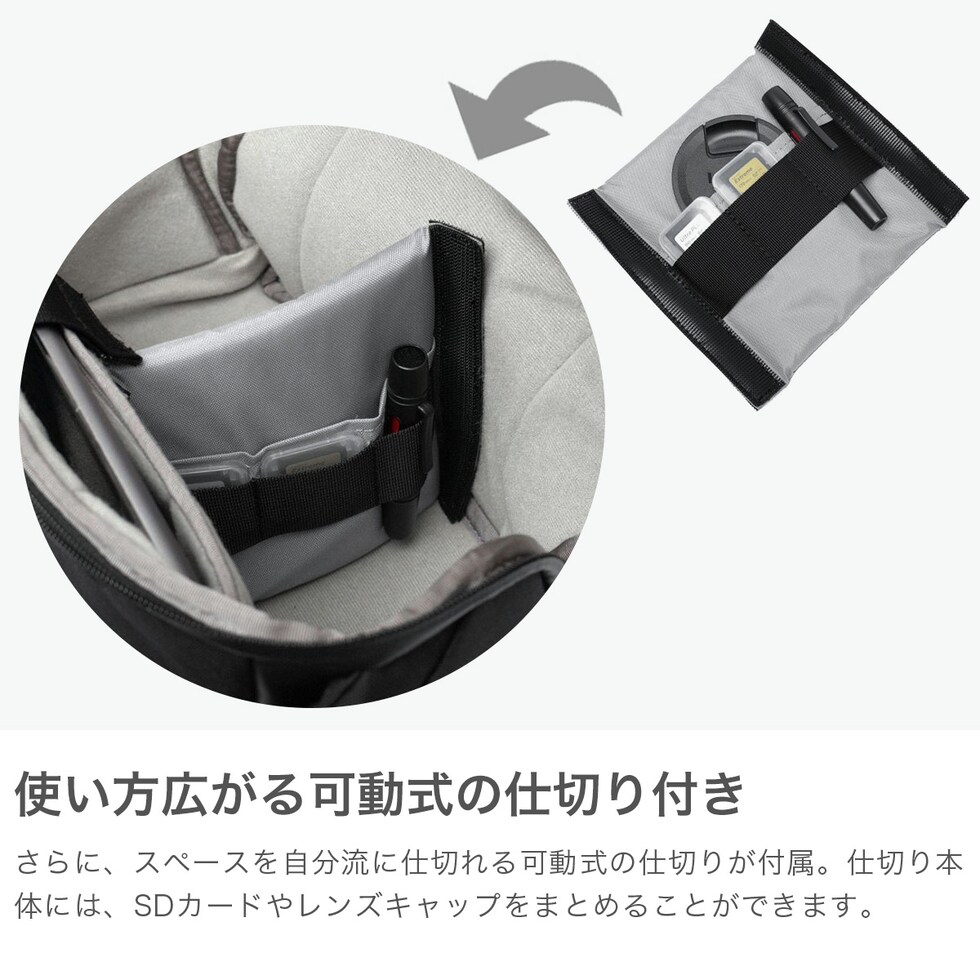 ビジネスとレジャーの両方に対応する「BLEISURE」シリーズのカメラバッグ。軽量で耐久性・耐水性に優れたオリジナルファブリックを採用しています。機材を守る6面クッションや可動式の仕切りを備え、タブレットやガジェットも整理して収納可能。底面のループは三脚も取り付けできる仕様です。利便性を追求した細かなギミックが光ります。日常から出張まであらゆるシーンで頼れるアイテムです。
