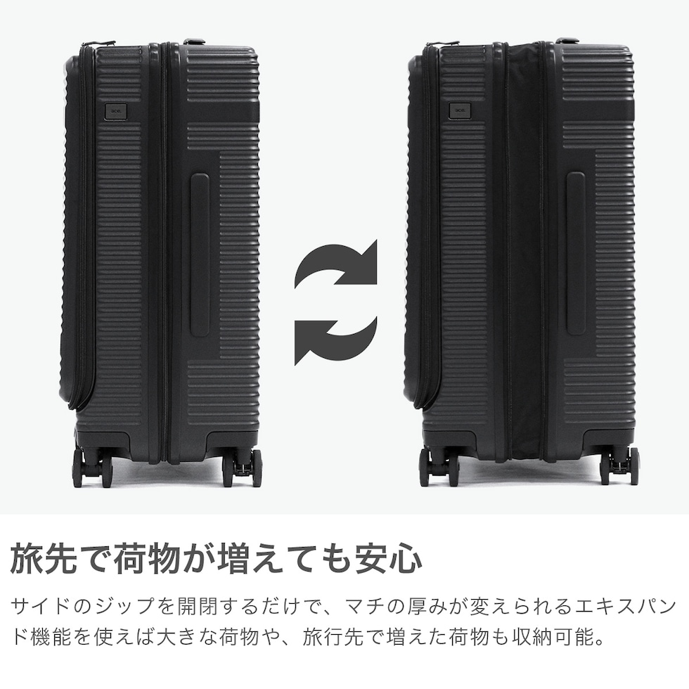 抜群の機能性が魅力 横リブを基調としたシンプルなデザインに機能性をプラスした『サルートン』シリーズ。こちらは4~6泊程度の長期旅行に適したサイズです。荷物の出し入れがしやすいフロントオープンタイプで、旅行先で増えたおみやげなどの収納にも対応できる拡張機能も搭載。快適な旅をサポートする充実した機能が備わっています。 |