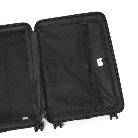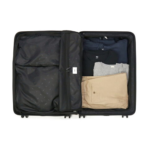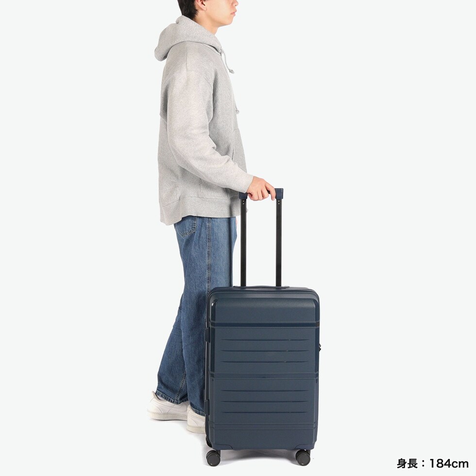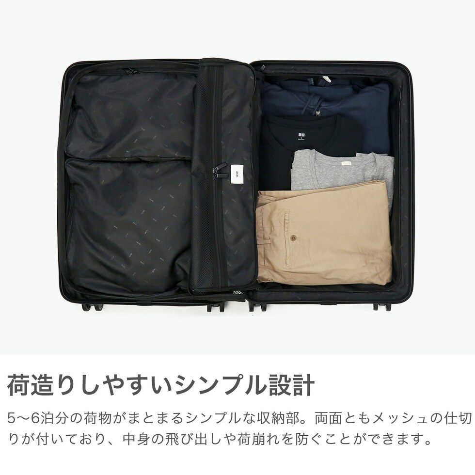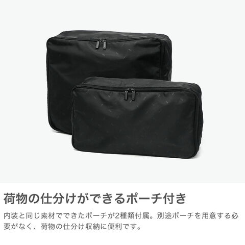 | 荷造りをスムーズにする ポーチ付きキャリー シンプルなデザインが魅力の「タクティシティー」シリーズ。こちらは、5~6泊の旅行に適した58L容量のスーツケースです。2種類のポーチ付きで、パッキングをよりスムーズに。シャフトやタイヤは全色ブラックで統一し、ハンドルは本体と同色にすることで、シックで洗練された雰囲気に仕上げました。 |